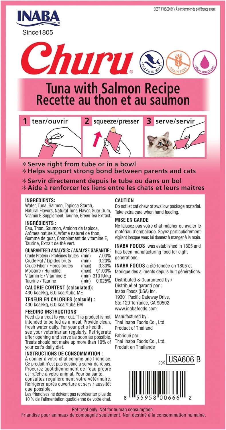 Treat your cat to INABA Churu Cat Treats—a grain-free, lickable purée snack made with wholesome ingredients like wild-caught tuna and farm-raised chicken. These squeezable tubes are packed with 91% moisture and only 6 calories per serving, making them a hydrating, guilt-free treat. Fortified with Vitamin E and taurine with no grains, preservatives, or artificial colors, these treats are perfect for hand feeding, topping meals, or sneaking in medicine. With a flavorful tuna and salmon recipe, INABA delivers a healthy and interactive treat your feline will love.
