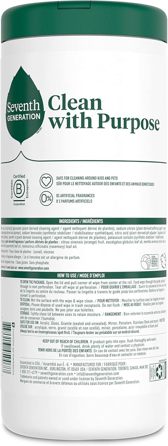 This product is designed not just for speed but for safe cleaning with minimal chemical impact. Seventh Generation crafts each wipe with botanical ingredients and a commitment to green chemistry, aiming for both household convenience and environmental responsibility.