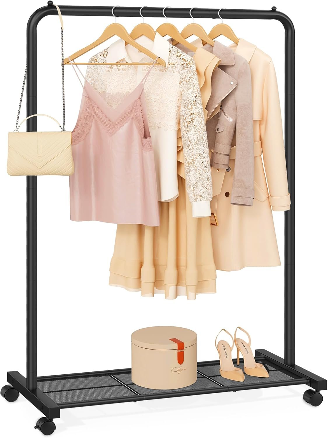 - Mobility and Versatility: Its wheeled garment rack design, with four universal casters (two with brakes), lets you move it smoothly across bedrooms or hallways with secure stability when locked.