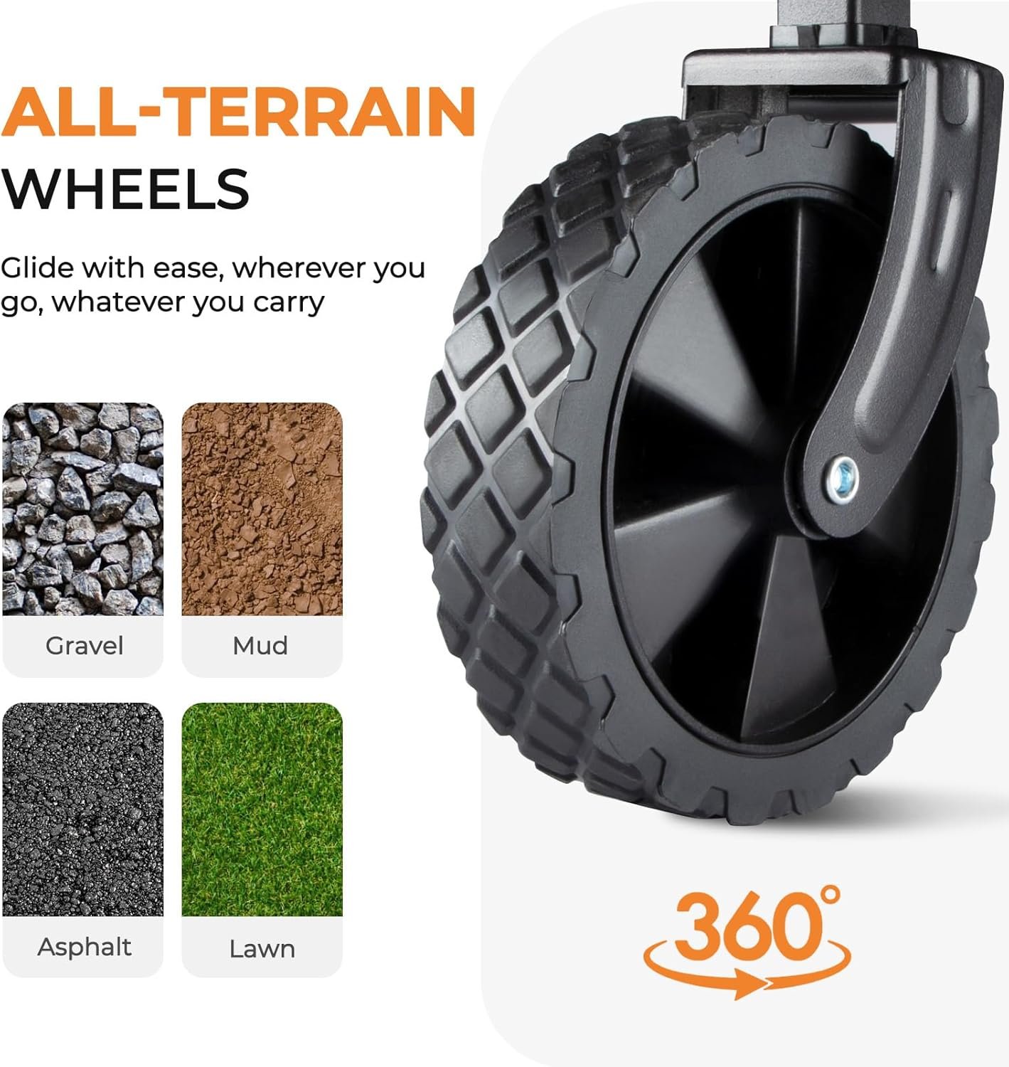 From outdoor utility to grocery runs, this heavy duty cart ups your transport game with its sturdy steel frame and high-capacity design. Weighing only 10.5 lbs but supporting up to 220 lbs, it handles both quick errands and full-day adventures.