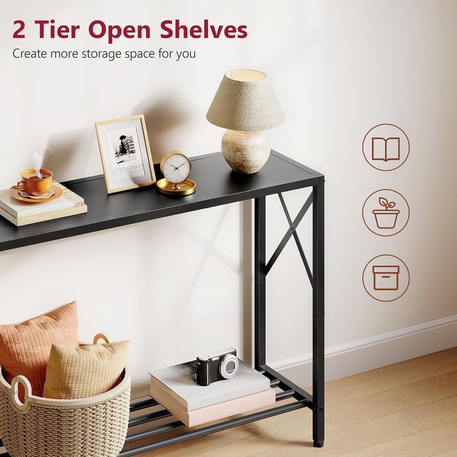 The Tajsoon Console Table is a sleek, narrow 2-tier entryway table designed to fit perfectly behind couches or in tight spaces like hallways and foyers. Crafted from sturdy wood and heavy-duty metal, it offers lasting durability and enhanced stability with an X-shaped frame and adjustable feet. This versatile black table provides ample storage for books, décor, or essentials, and is easy to assemble with clear instructions. Upgrade any entrance or living area with Tajsoon’s stylish and functional console table.