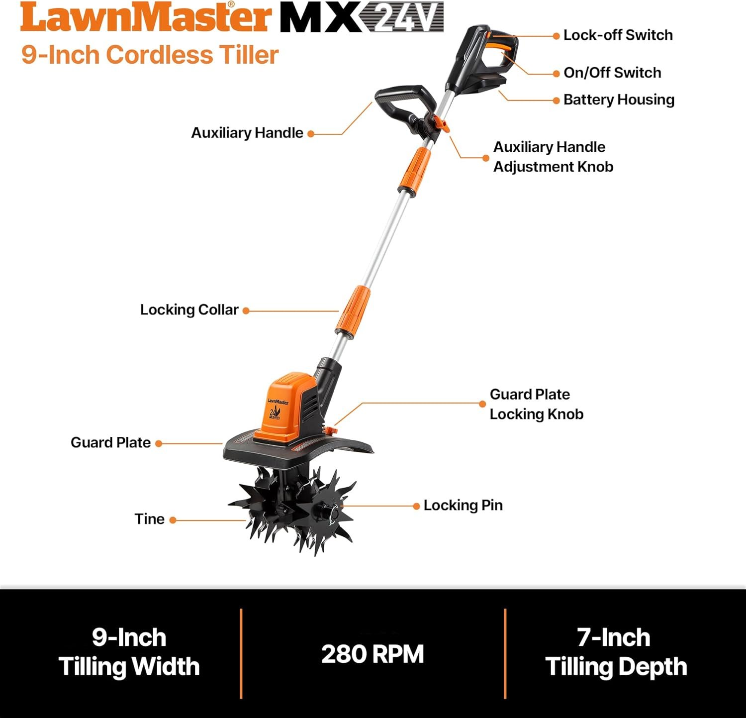 The LawnMaster 24V MAX 9” Cordless Tiller is perfect for small to medium gardens, offering a generous 9-inch cutting width and 7-inch depth to make soil cultivation a breeze. Lightweight at under 12 lbs and powered by a rechargeable 24V battery, it lets you till anywhere without cords or emissions. Four durable, rust-resistant steel blades run at 280-RPM for quick and efficient results, while detachable blades make cleaning effortless. For eco-friendly, hassle-free yard work, this tiller from the LawnMaster Store is a smart choice for any gardener.