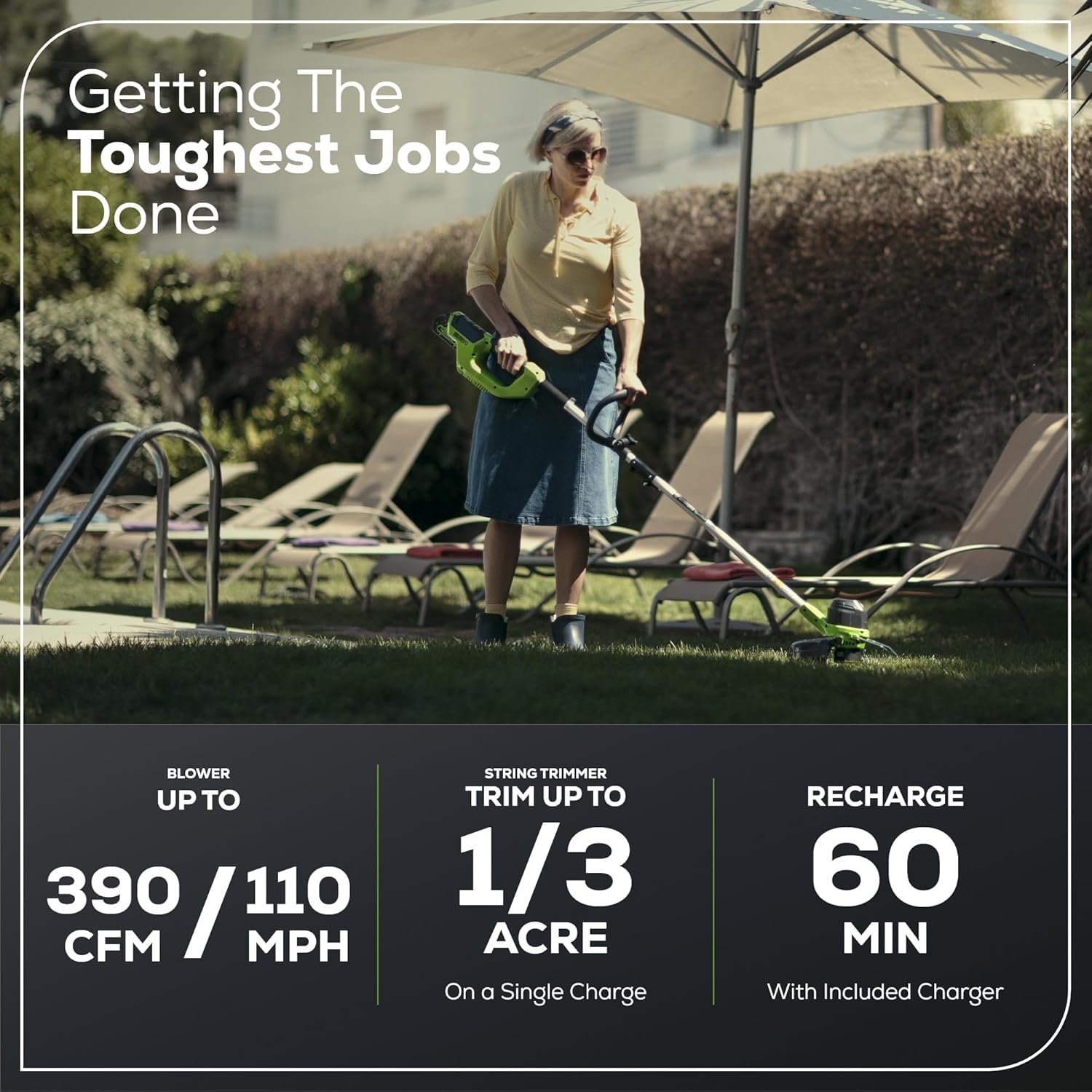 Greenworks has truly combined convenience and effectiveness, making brush clearing and light debris removal straightforward even if you lack strength or experience. The included leaf blower works efficiently for quick seasonal cleanups, keeping patios and driveways pristine. Together, they offer DIYers and pros alike a full lawn care combo solution for everyday needs.