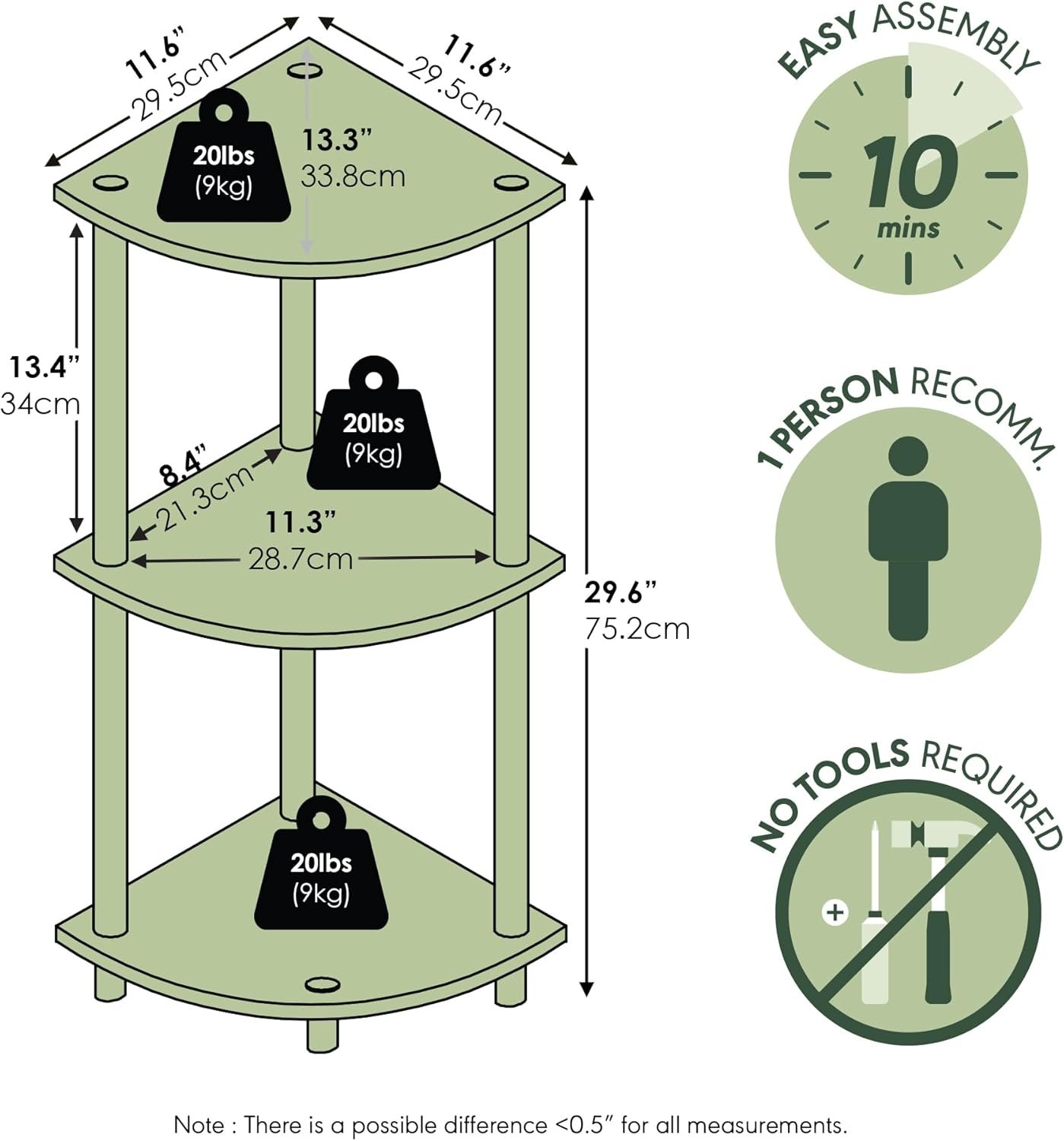 • Sustainable Materials: Built with FSC-certified wood and plastic tubes, the Furinno corner unit supports up to 20 lbs per shelf, reliably holding lightweight living room shelves essentials or office gadgets.