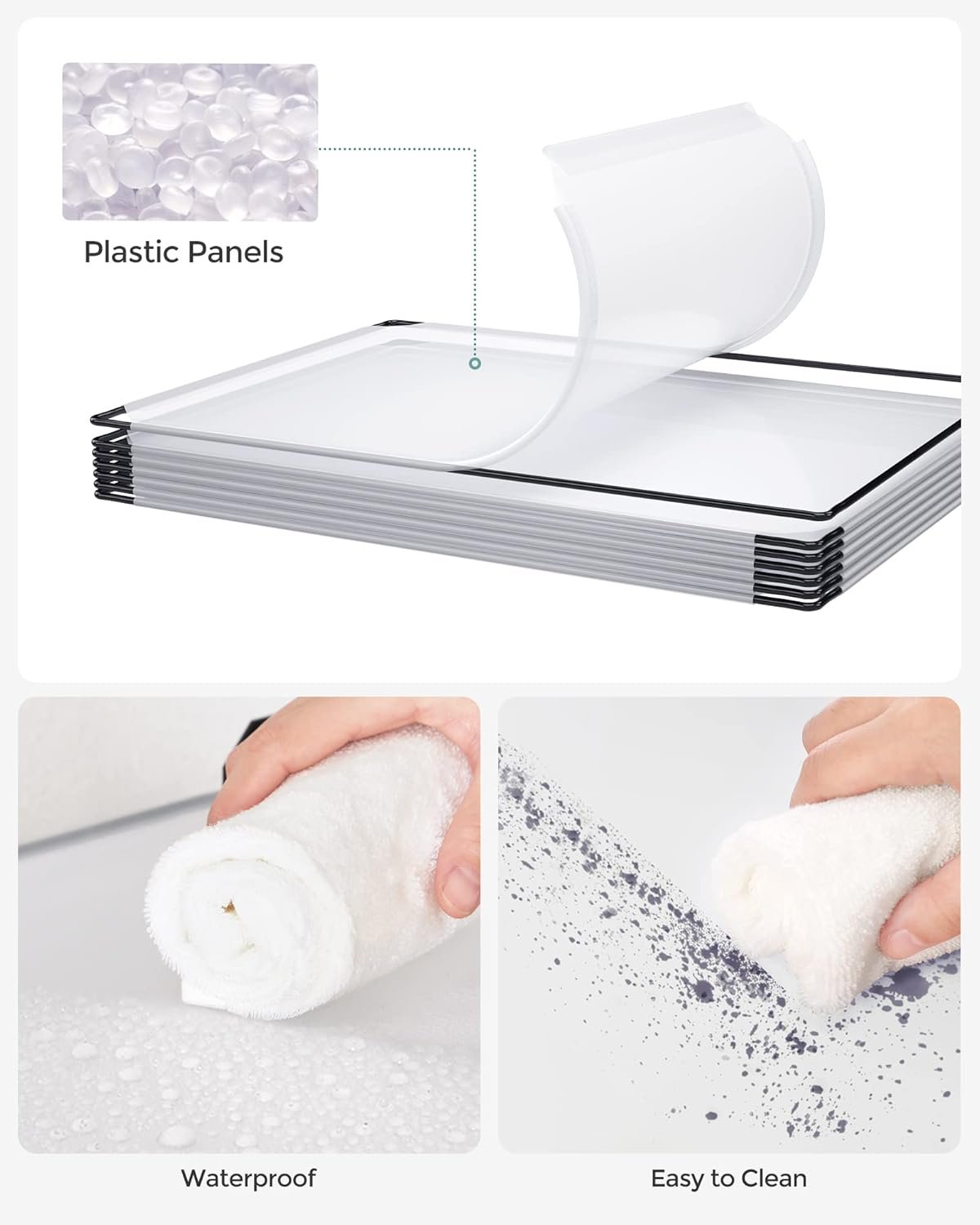 Yes, the panels are made of waterproof PP plastic, so spills, dust, or stains wipe off easily—making it ideal for laundry, bedrooms, or children’s playrooms.