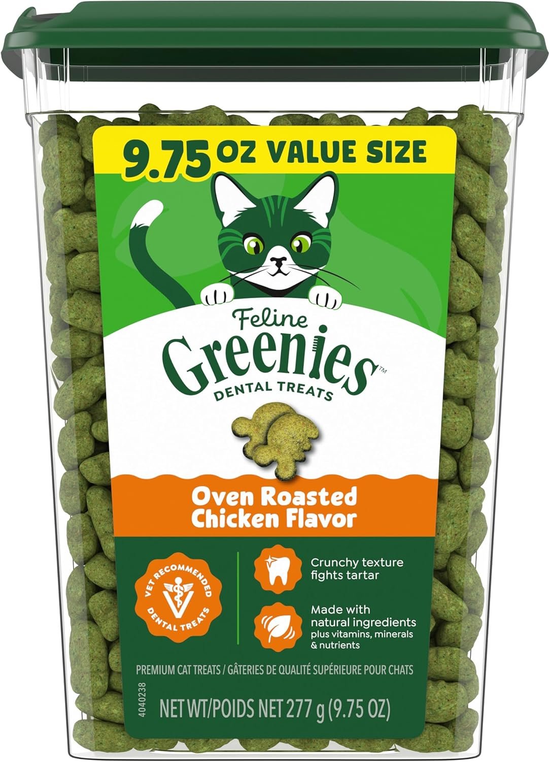 Greenies Cat Treats, from the trusted Greenies Store, offer veterinarian-recommended dental care for your adult cat with a delicious oven roasted chicken flavor in a convenient 9.75 oz. tub. Their crunchy texture is clinically proven to reduce tartar by 36% in just 28 days, helping maintain fresh breath and oral hygiene. With less than two calories per treat, you can reward your cat guilt-free while supporting their dental health. Give your feline friend a treat they'll love and a healthier smile today!