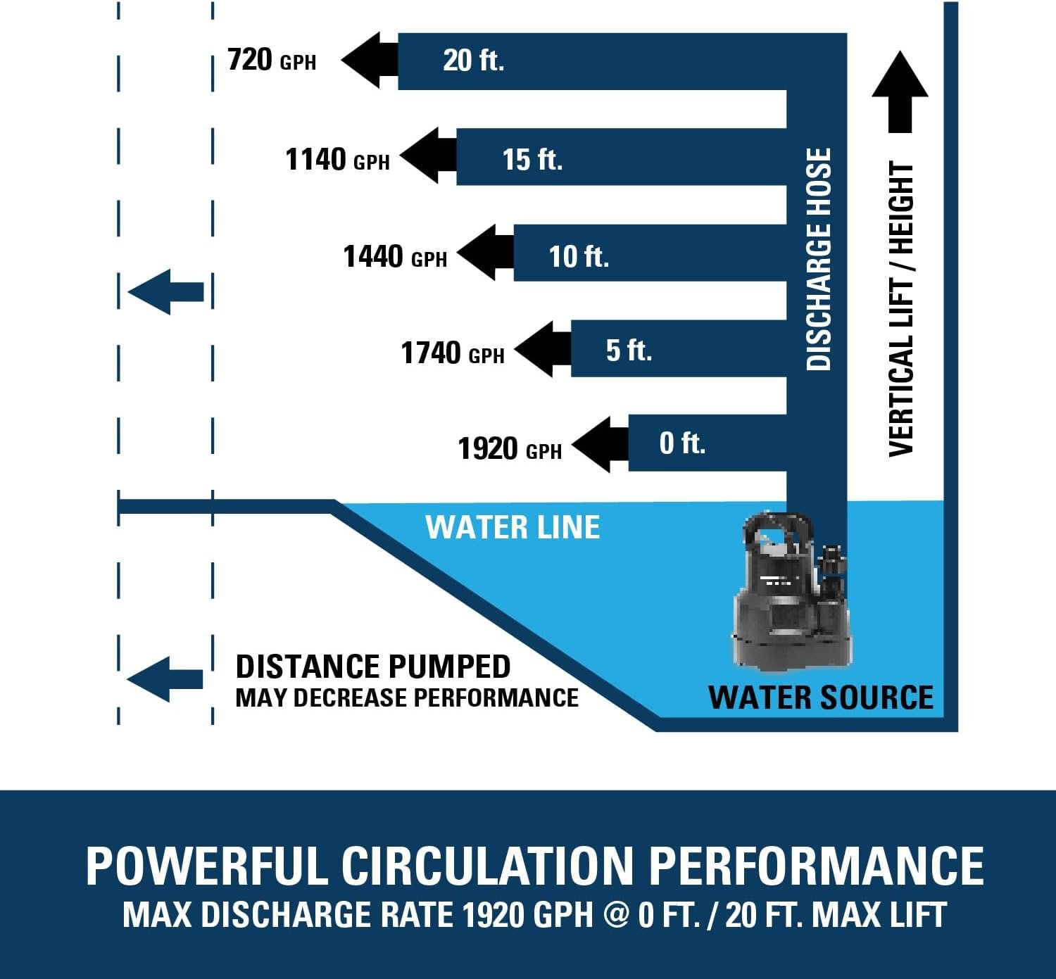 - Powerful Utility Pump: Its 1/6HP thermoplastic impeller moves up to 1920 gallons per hour, tackling scale efficiently. The superior pump handles up to 20 feet vertical lift during operation.