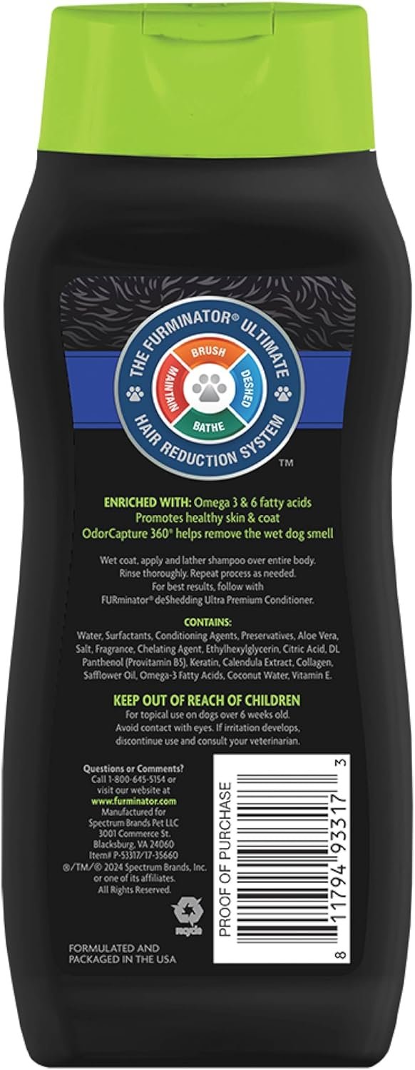 The FURminator Ultra Premium deShedding Shampoo for Dogs is expertly formulated to reduce excess shedding while nourishing your pup’s skin and coat with multiple conditioning agents. Featuring advanced OdorCapture 360 technology, it effectively eliminates wet dog smell, leaving your pet fresh and clean. Free from parabens and chemical dyes, this gentle shampoo from the FURminator Store is perfect for regular grooming. For best results, pair it with other FURminator products for a complete deShedding and conditioning system—your dog (and your furniture) will thank you!