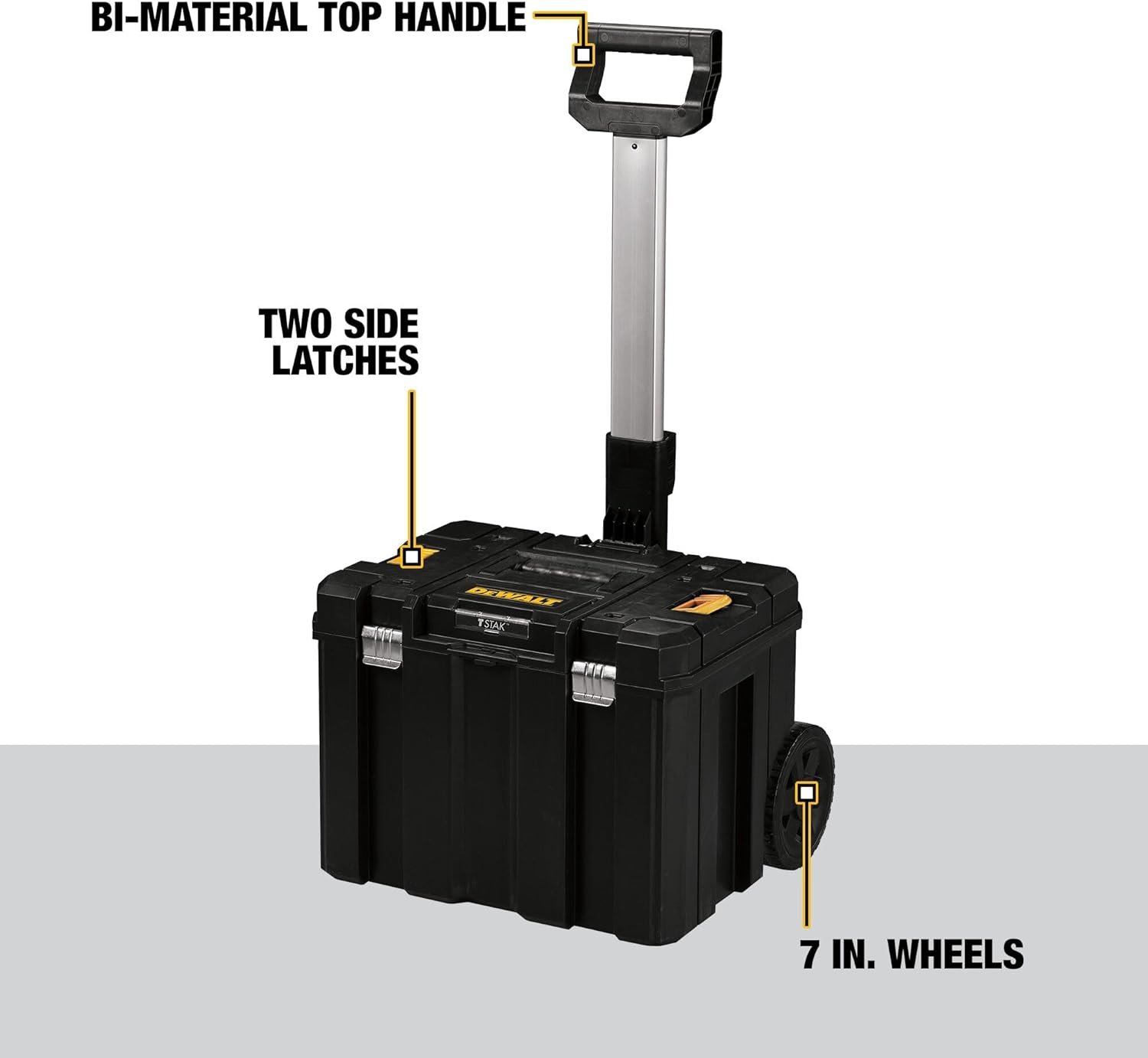 The DEWALT TSTAK Mobile Storage Deep Box on Wheels delivers rugged, portable storage for tools, gardening gear, and workshop essentials with a large volume compartment and durable 7″ wheels for easy mobility. Built with rust-resistant metal latches, a bi-material top handle, and a telescopic handle, this rolling toolbox makes transport effortless and keeps gear organized and secure. Compatible with other TSTAK stackable units, it offers customizable storage solutions that grow with your needs.