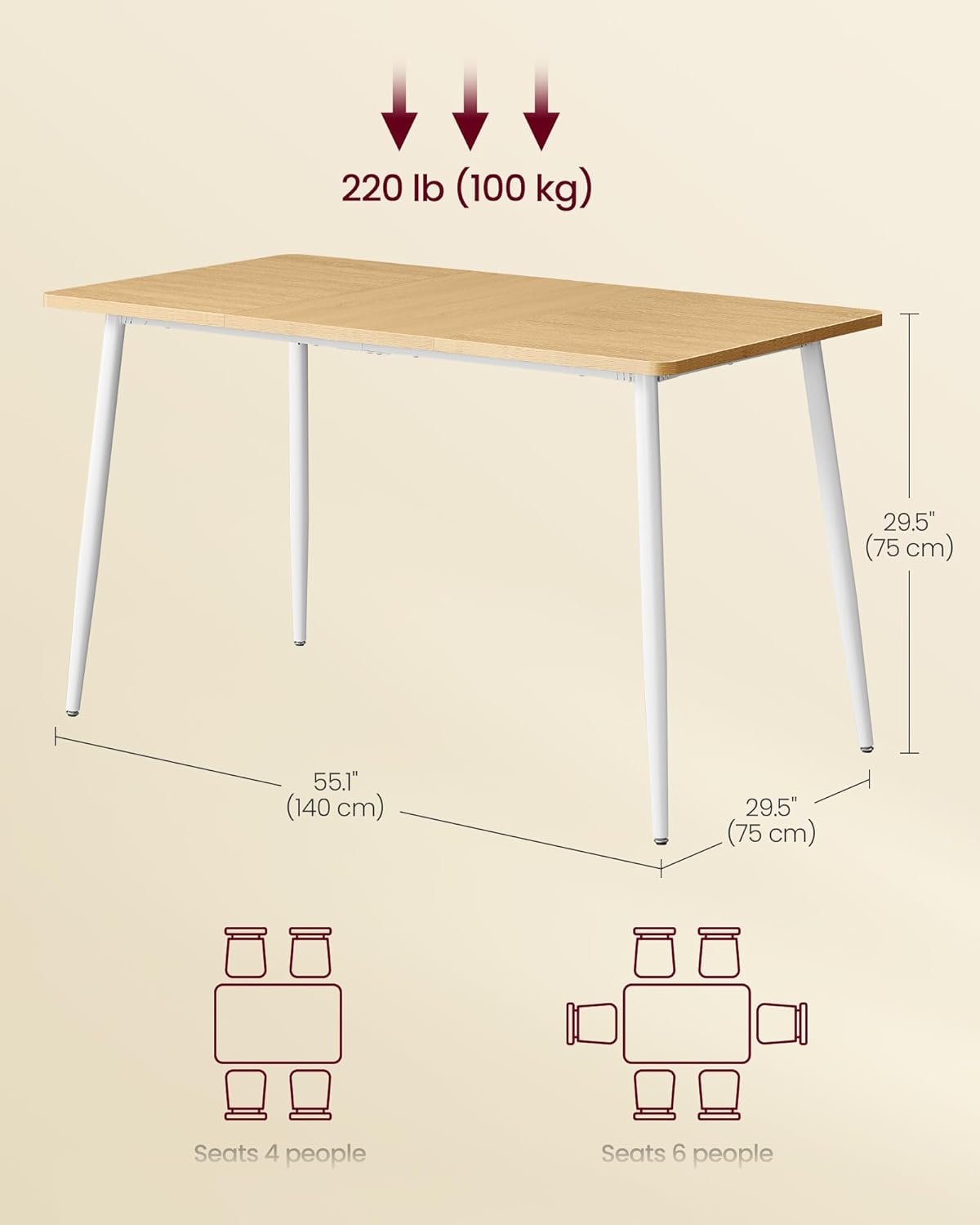 With its golden oak finish and cloud white legs, this table integrates seamlessly into both casual kitchens and updated farmhouse decor. The combination of a scratch resistant, heat resistant surface and sturdy steel legs ensures you’ll enjoy years of reliable daily use.