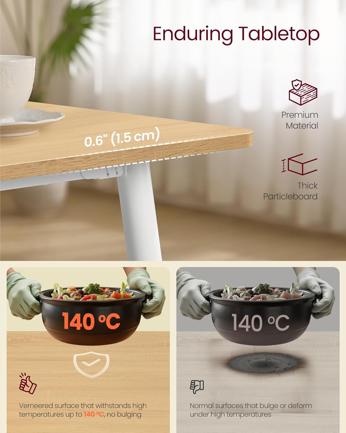• Heat & Scratch Resistant: Engineered for real life, the veneered surface resists hot dishes up to 140°C and everyday scratches.