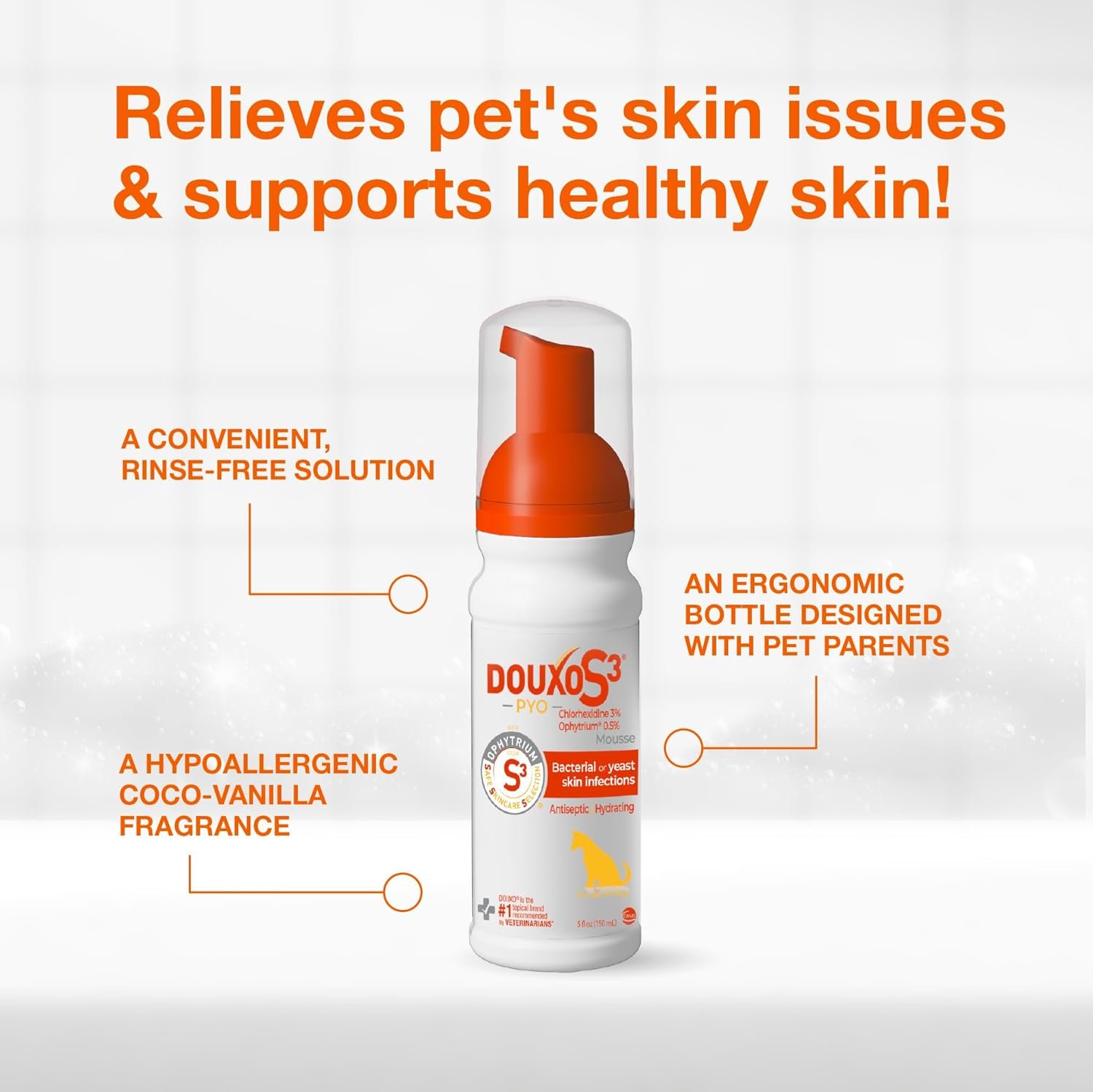Douxo S3 Pyo Mousse for Dogs is the #1 non-prescription topical solution recommended by U.S. veterinarians for managing canine skin infections. This antiseptic mousse combines 3% chlorhexidine and 0.5% ophytrium to hydrate, soothe irritation, and strengthen the skin’s barrier—all without soaps, sulfates, parabens, dyes, or nanoparticles. Ideal for tackling bacterial or yeast skin issues, it's a gentle yet effective option from the trusted Douxo S3 brand. Give your dog reliable, vet-recommended skin care with ease and peace of mind.