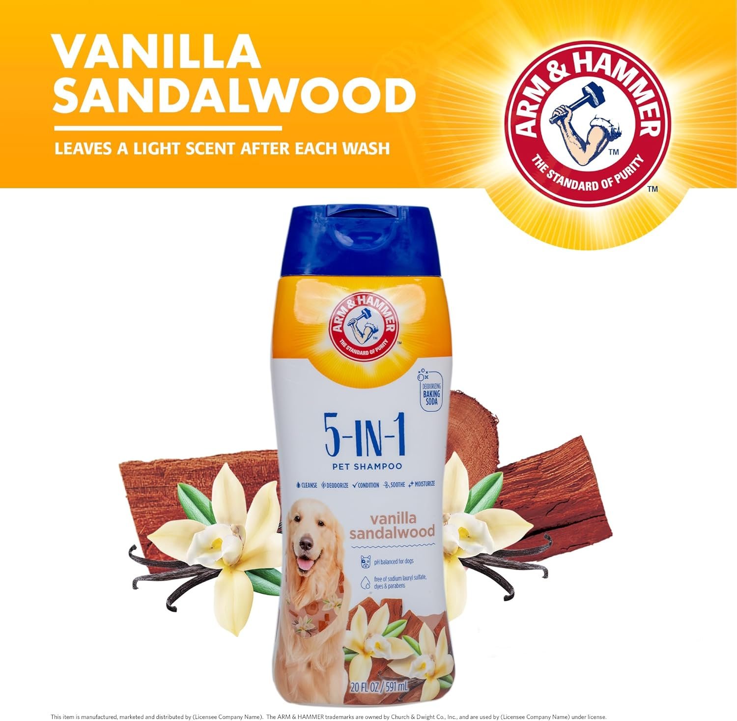 Arm & Hammer for Pets 5-in-1 Pet Shampoo with Conditioner is specially formulated for dogs, using a pH-balanced blend that respects their unique skin needs. Infused with natural baking soda, oatmeal, aloe, and shea butter, this gentle formula deodorizes, cleans, conditions, soothes, and moisturizes, leaving your pet's coat soft and fresh. The vanilla sandalwood scent offers a pleasant, long-lasting fragrance, while the absence of harsh chemicals ensures peace of mind. Choose this multitasking shampoo from Arm & Hammer for a healthier, happier pup.
