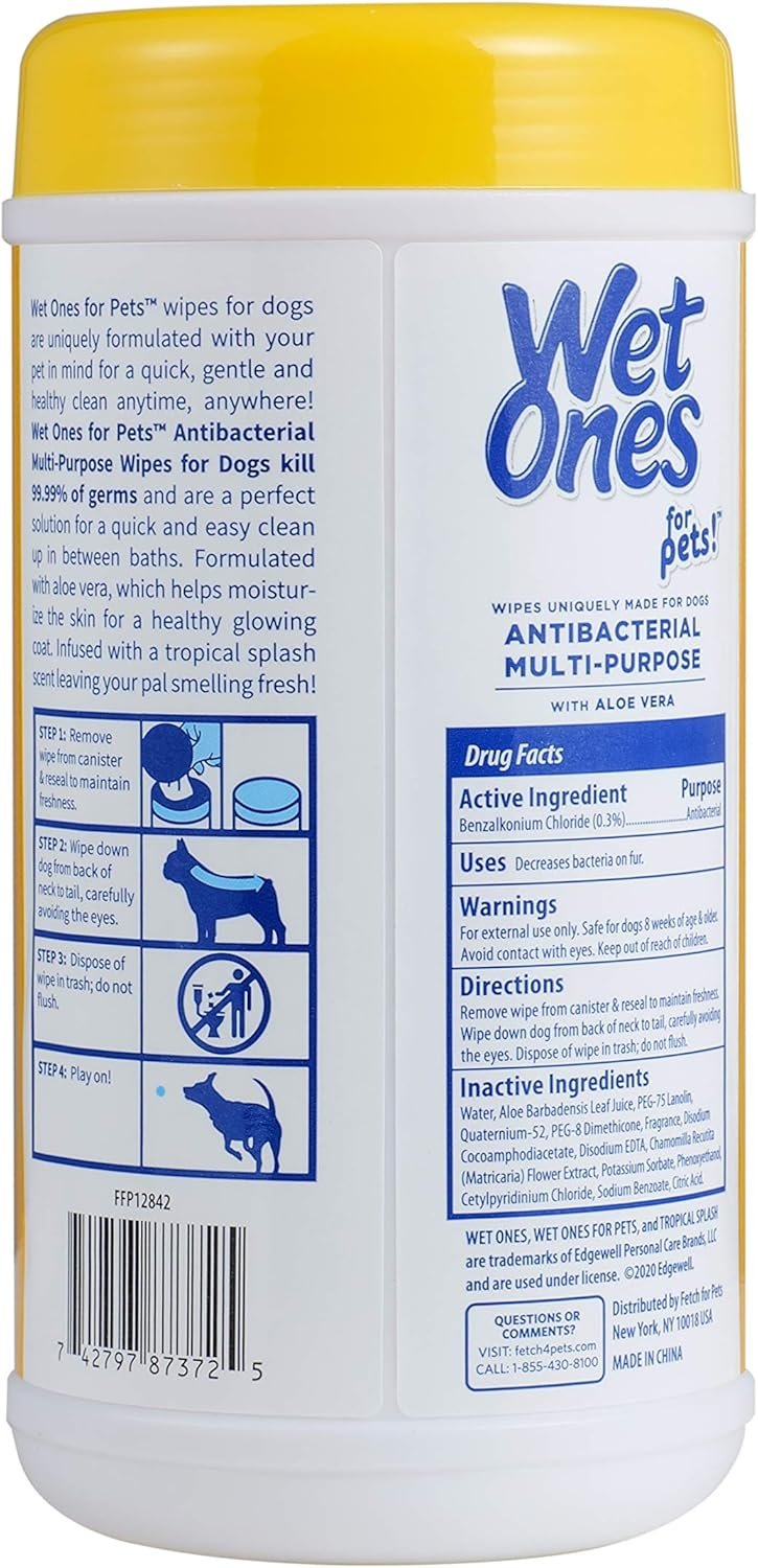 Wet Ones for Pets Multi-Purpose Dog Wipes from the Wet Ones Store offer a convenient and effective way to keep your dog clean and fresh between baths. Infused with soothing aloe vera, these wipes gently remove dirt, dander, and debris, while leaving a pleasant Tropical Splash scent. The easy-to-use, resealable 50-count cannister ensures the wipes stay moist and ready for use. Perfect for all dogs, these all-purpose wipes are a must-have for pet owners looking for cleanliness and comfort in one simple step.