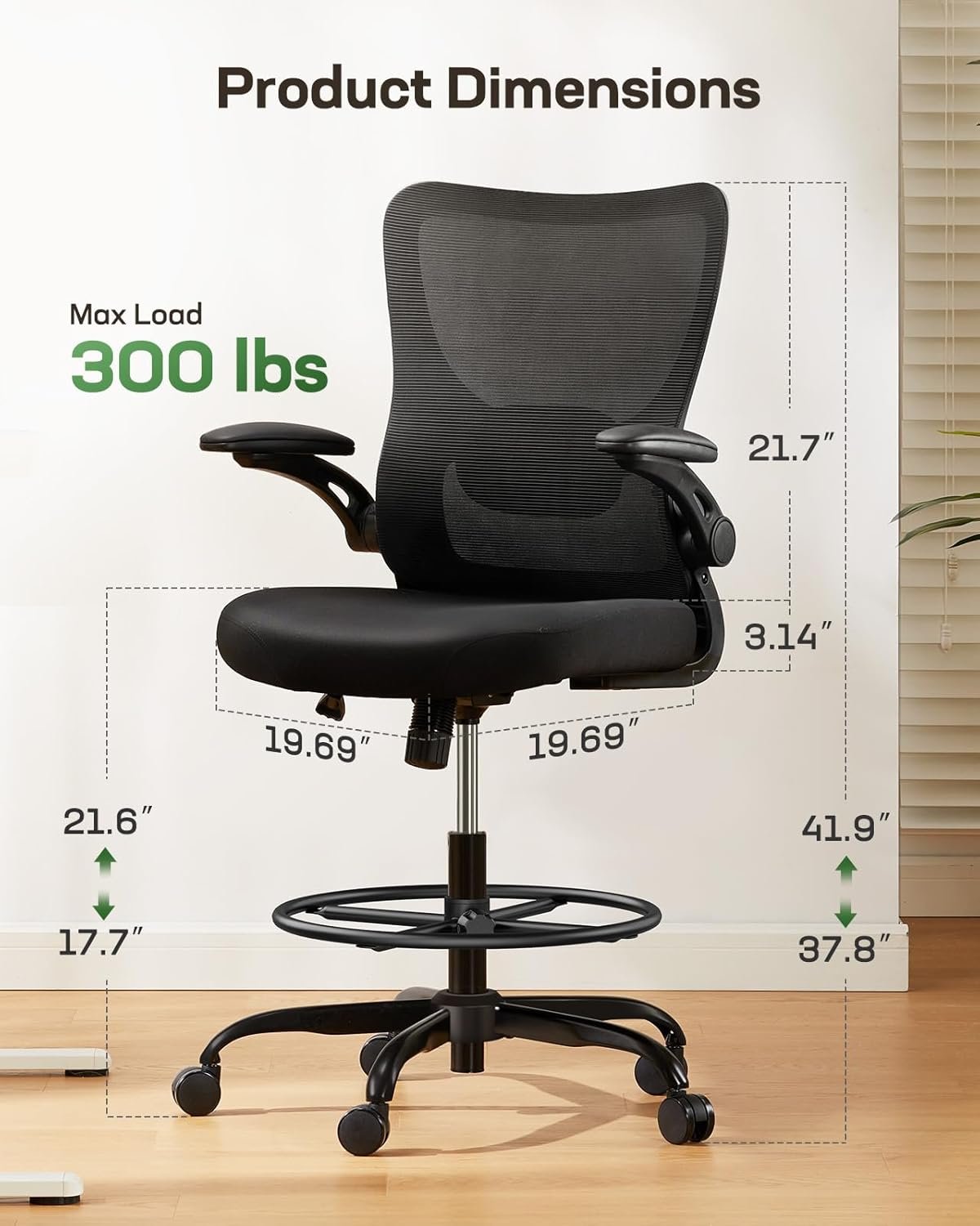 The drafting chair is designed for comfort and versatility in any home office or creative workspace. This product stands out with its ergonomic design, offering customizable support whether you’re working at a tall desk or transitioning between sitting and standing throughout the day.