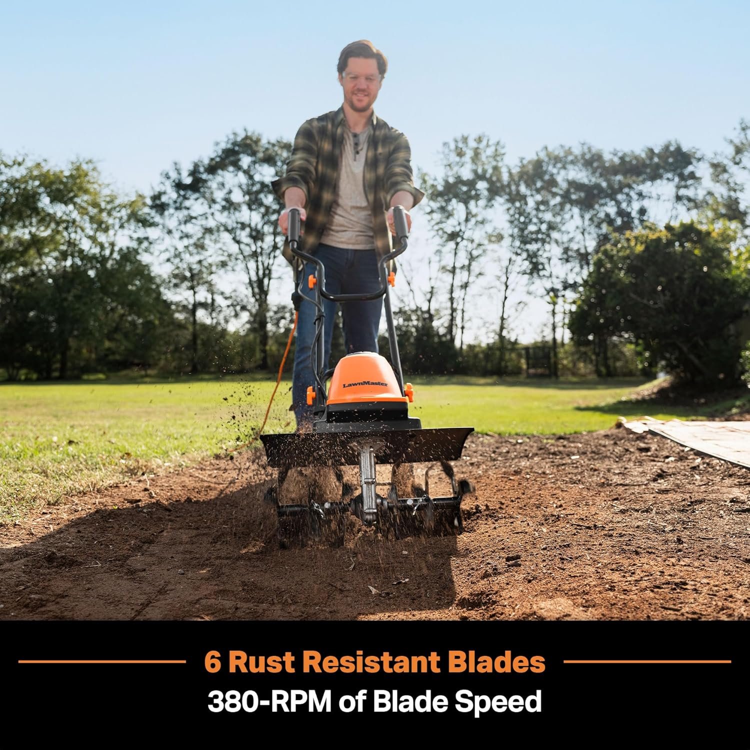 - Powerful Motor: 13.5 Amp motor drives 6 rust resistant blades at up to 380 RPM for rapid soil tilling.