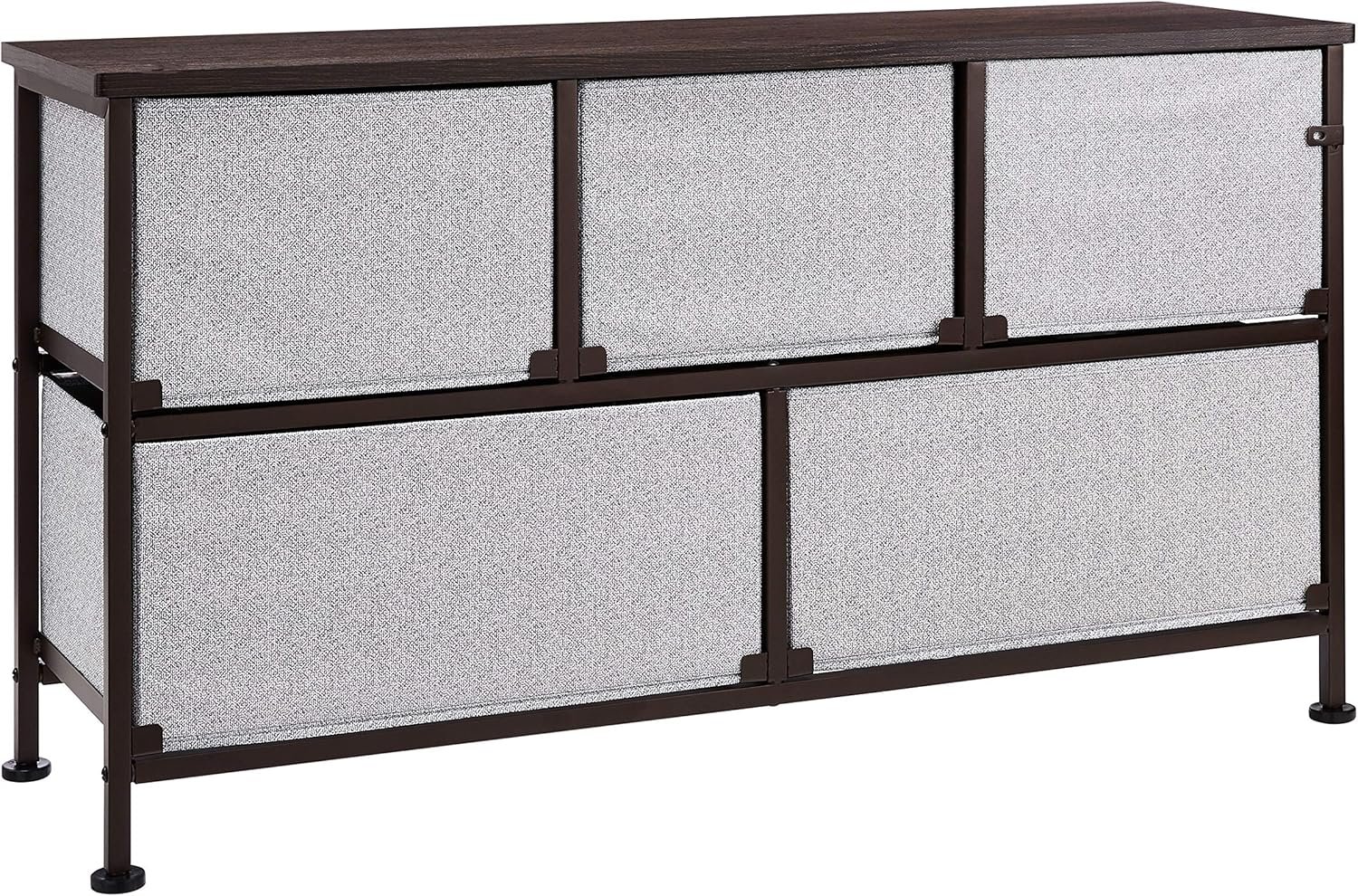 The Amazon Basics Extra Wide Fabric 5-Drawer Storage Organizer Unit is an ideal solution for creating tidy and stylish spaces in your home. With a sturdy steel frame, laminated wood top, and lightweight removable drawers, this organizer fits seamlessly in bedrooms, closets, and playrooms. Its contemporary design from the trusted Amazon Basics Store, easy pull-out handles, and adjustable plastic feet ensure both convenience and durability, making it a smart addition for any home.