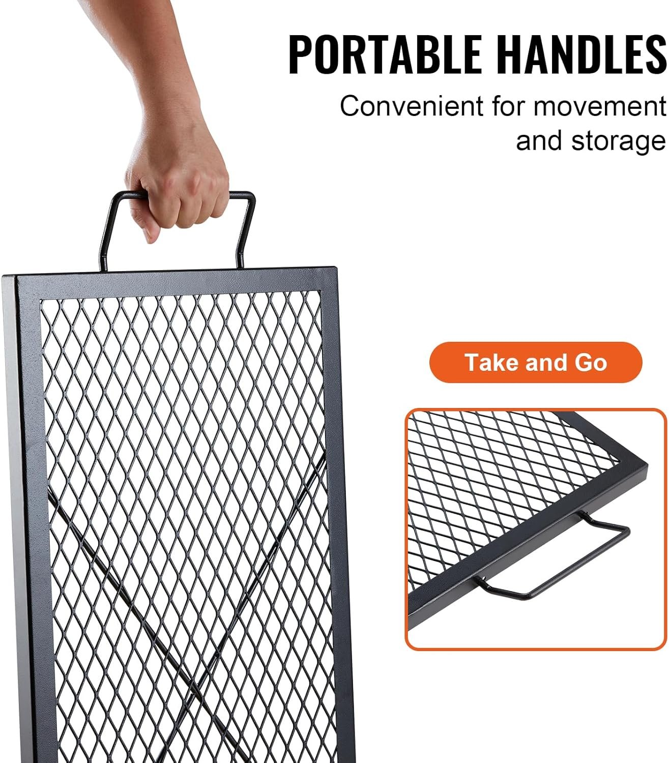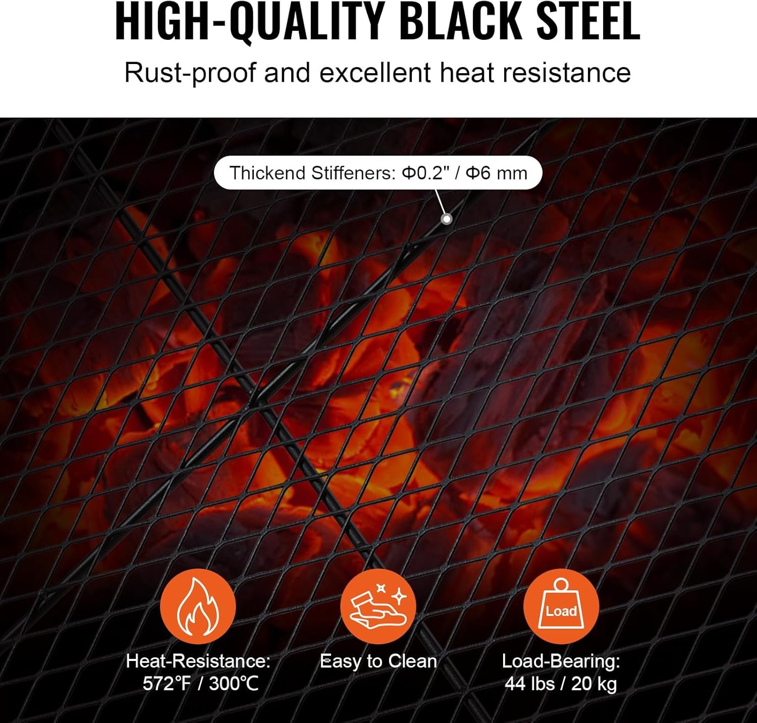 The VEVOR X-Marks Fire Pit Grill Grate is a heavy-duty, 32-inch steel cooking grate perfect for outdoor gatherings with family and friends. Its spacious 32 x 15-inch cooking area holds up to 25 pounds of food and features a durable, rust-proof, high-temperature-resistant build for reliable performance. The diamond-shaped mesh design ensures even heat distribution while the convenient handle makes it effortlessly portable for camping, picnics, and parties. Ideal for grilling everything from steaks to veggies, this VEVOR grill grate is a must-have for outdoor cooking enthusiasts.