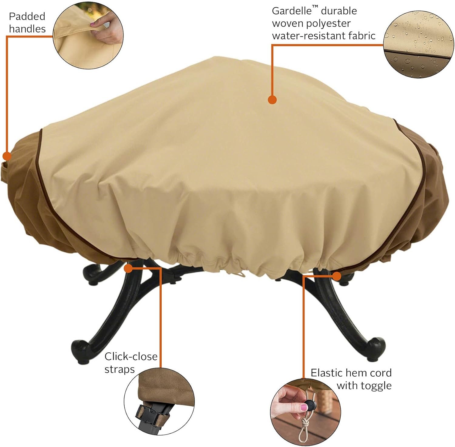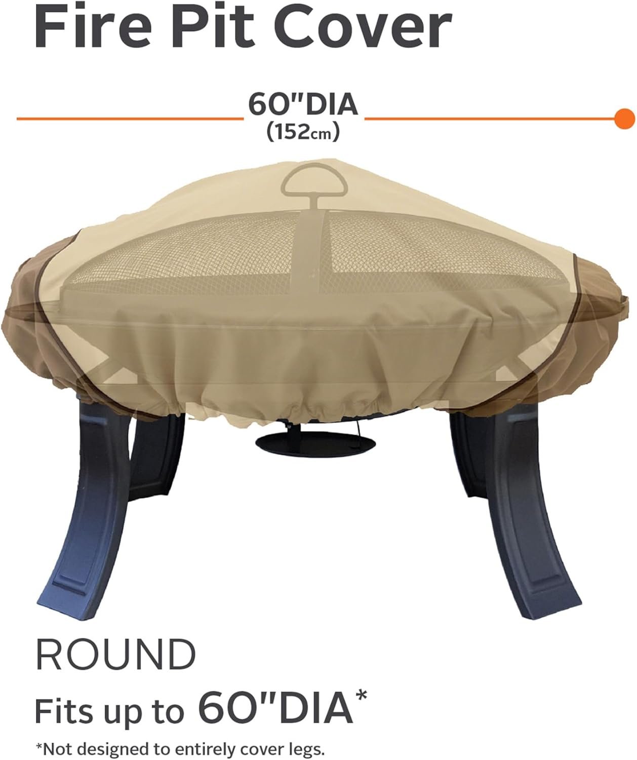 Protect your outdoor fire pit with the Classic Accessories Veranda Water-Resistant 60 Inch Round Fire Pit Cover, designed to fit fire pits up to 60 inches in diameter. This durable cover features Gardelle Fabric with a water-repellent top, splash guard skirt, and air vents to prevent condensation and wind lofting. Easy to use with padded handles, adjustable elastic hem, and secure click-close straps, it offers reliable protection and a perfect fit. Backed by a three-year limited warranty, it’s a top choice from the trusted Classic Accessories Store for keeping your patio furniture looking great year-round.