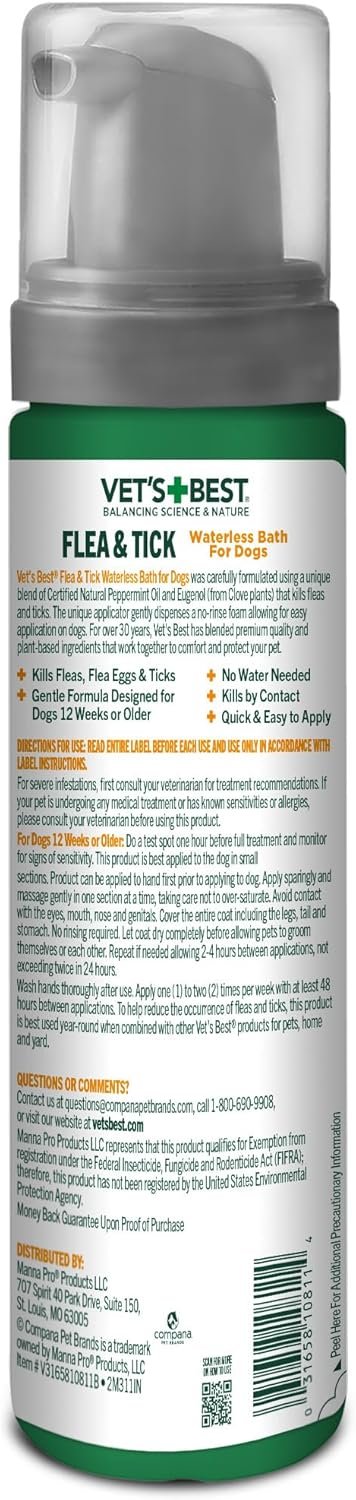 Keep your dog protected from pesky pests with Vet's Best Natural Flea and Tick Waterless Bath for Dogs. This no-rinse, dry foam shampoo from Vet's Best uses certified natural ingredients like peppermint oil and eugenol to effectively kill fleas, ticks, and their eggs—plus it repels mosquitoes. Convenient for water-shy pets, it requires no rinsing and contains no harsh chemicals or added fragrances, ensuring a gentle yet powerful solution. Proudly made in the USA, it's a safe and easy choice for pet owners seeking effective, plant-based flea and tick control.