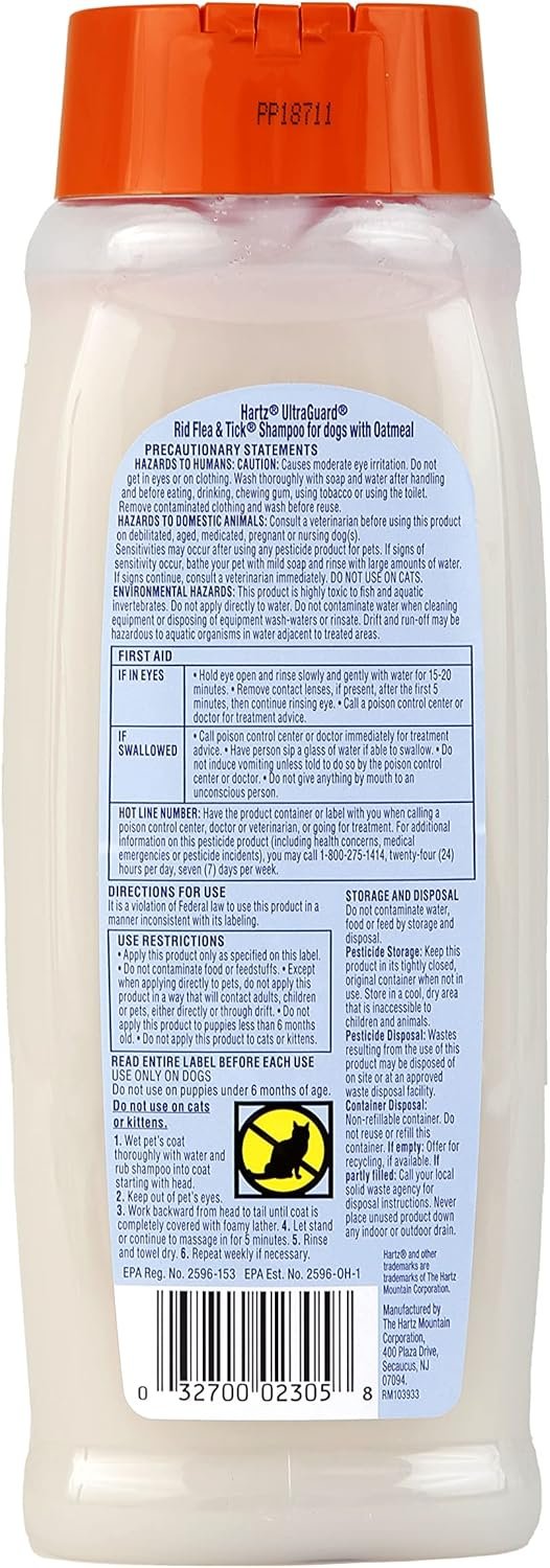 The Hartz UltraGuard Rid Flea & Tick Oatmeal Dog Shampoo is a powerful cleansing solution that kills fleas and ticks on contact while offering soothing relief for itchy, irritated skin. Enriched with oatmeal, this fresh-scented shampoo from Hartz can be used weekly, making it perfect for both preventative care and deodorizing your dog. Ideal for dogs and puppies 6 months and older, its gentle formula ensures your pet stays comfortable and protected. Give your furry friend the ultimate care with this 18 oz bottle from the trusted Hartz brand.