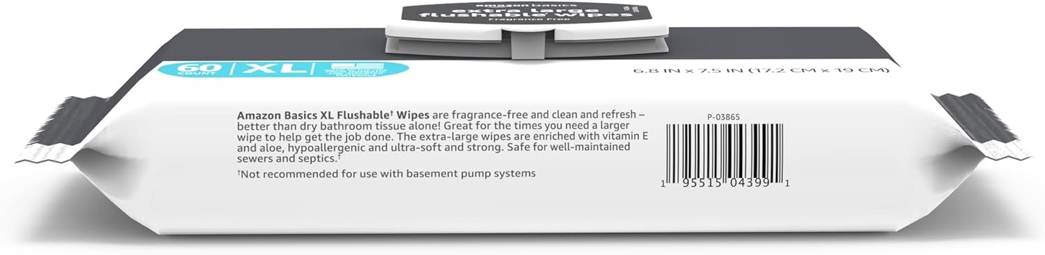 Experience a confident clean with Amazon Basics Extra Large Flushable Wipes—now over 40% larger for superior coverage. Each pack contains 60 fragrance-free, pH-balanced wipes, enriched with Vitamin E and Aloe for gentle yet effective cleansing. Made without plastics, parabens, or alcohol, these FSC-certified wipes are eco-friendly and skin-safe. With a convenient resealable closure and a total of 180 wipes per purchase, this is a must-have from the Amazon Basics Store for a fresh, worry-free clean every time.