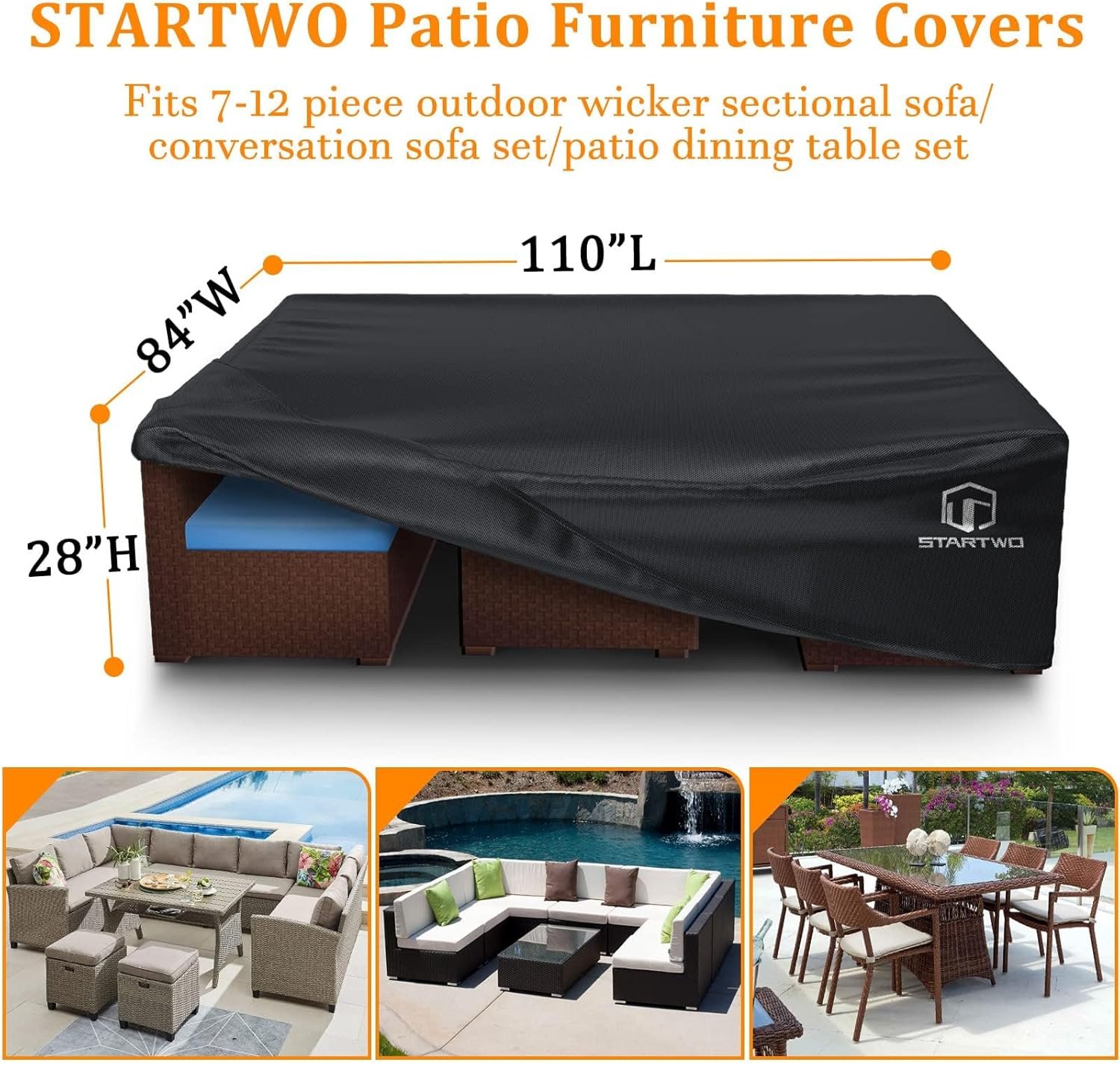 Protect your outdoor sectional sofa and chairs with the STARTWO Patio Furniture Cover, designed for 7-12 seat sets. Crafted from heavy-duty 500D fabric, this waterproof and UV-resistant cover shields your furniture from harsh weather, dust, and damage, ensuring it always looks new. Easy to install with secure straps and windproof buckles, it also features a vent design for optimal air circulation. Choose STARTWO for reliable all-season protection and effortless peace of mind.