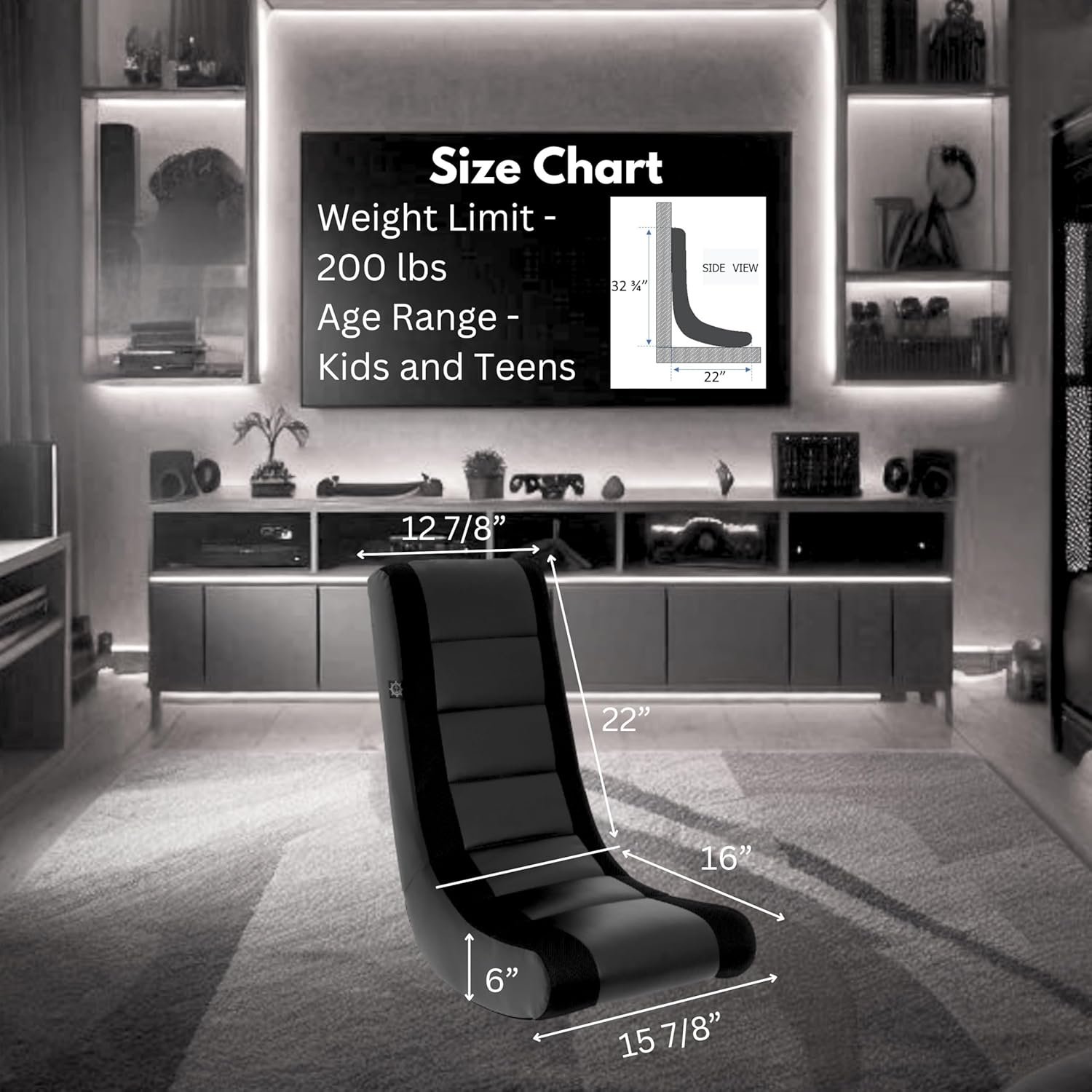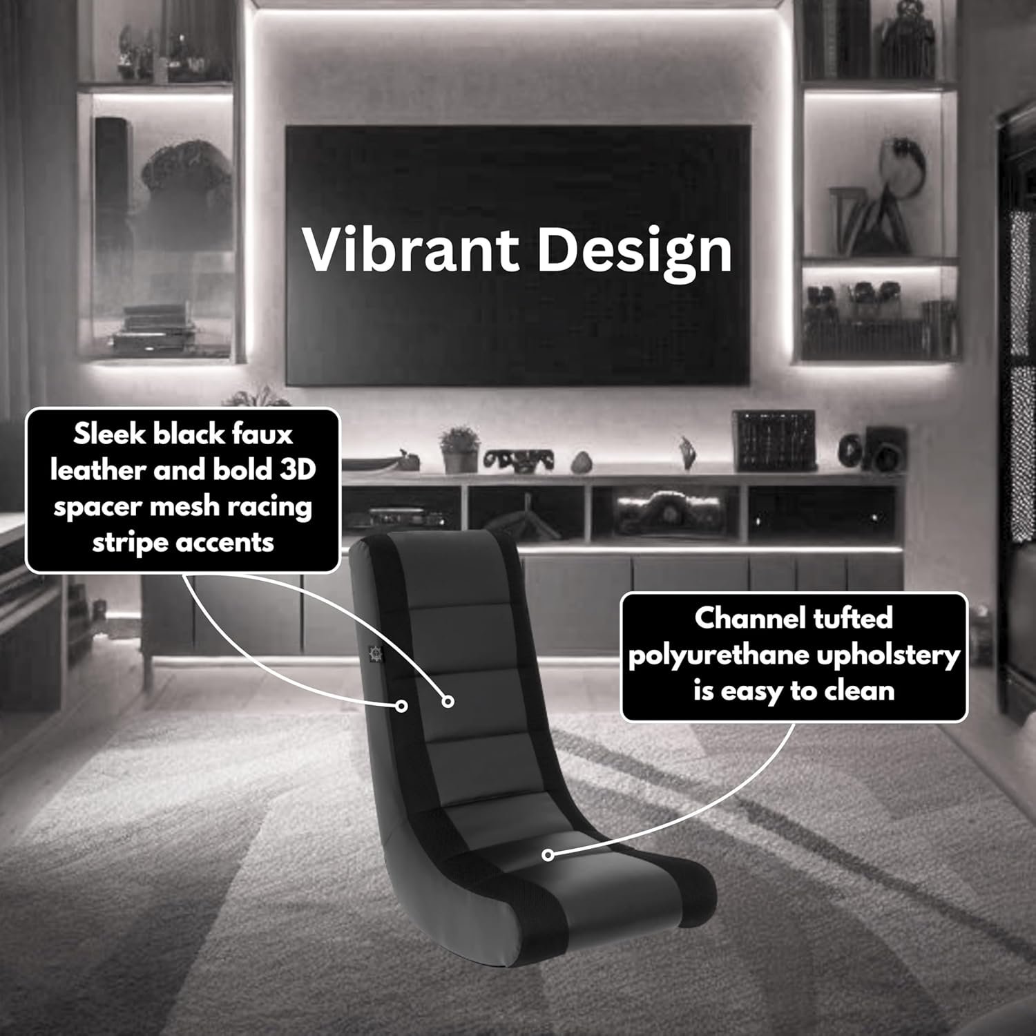 Designed to sit directly on the floor, this model doubles as a teens gaming seat and a living room rocker. The black faux leather and polyester mesh finish adds contemporary style suitable for any decor. It’s ideal for marathon game nights or simply relaxing with a movie.