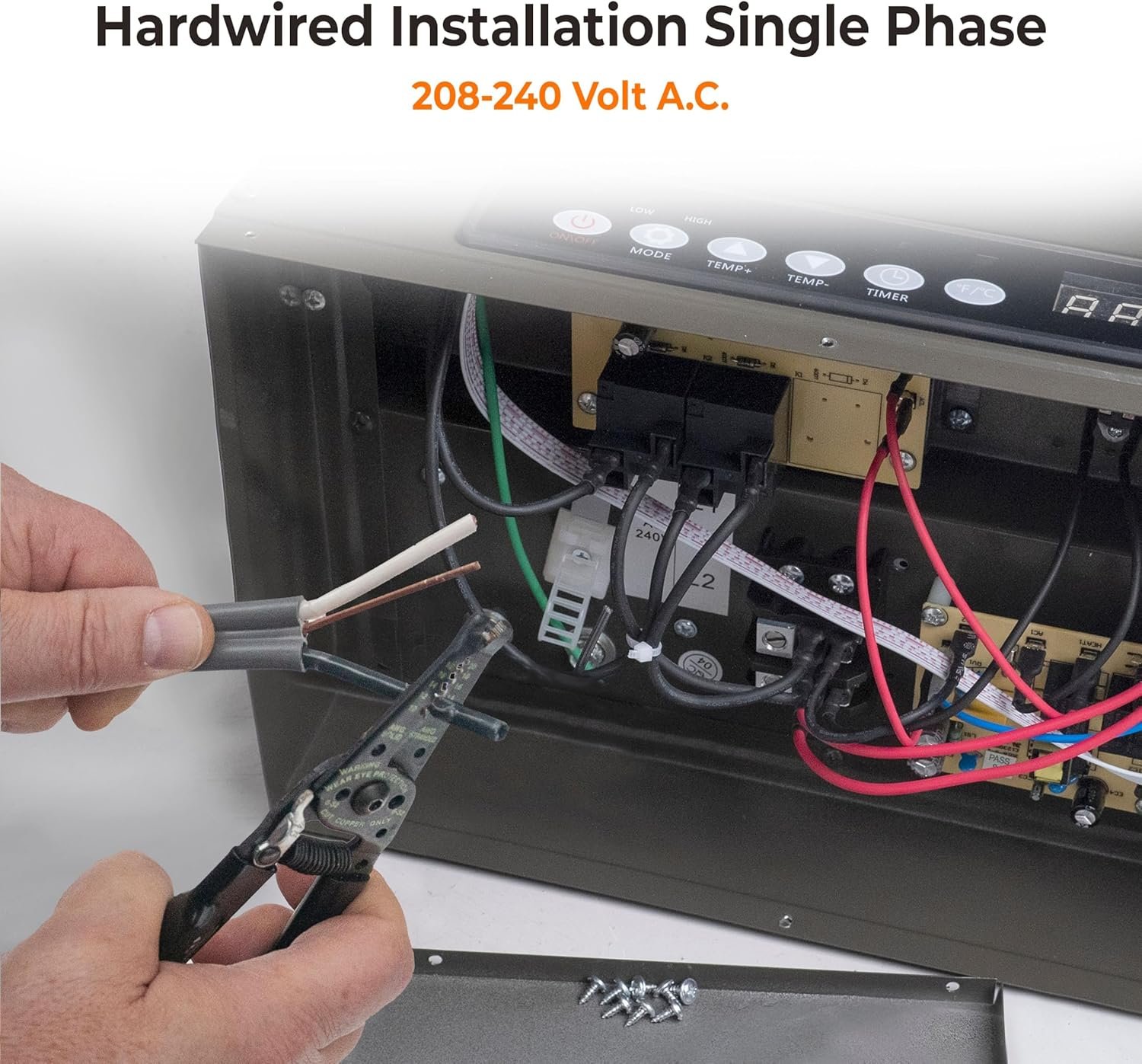 • Hard-wired Installation: This model requires a 240V AC plug, supporting a high-output, reliable setup common in commercial garage heater applications.