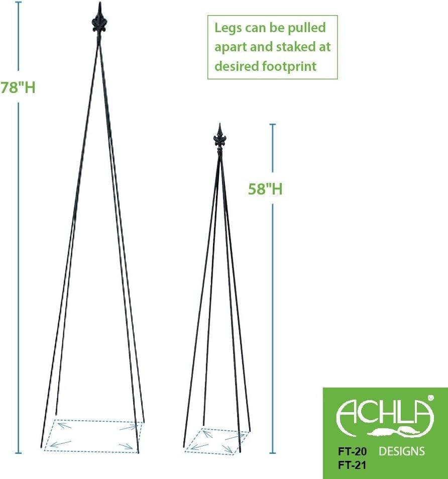 The Achla Designs FT-20A Fleur-De-Lis Staked Trellis offers an elegant and durable solution for supporting climbing plants in your garden or containers. Featuring a striking fleur-de-lis accent and black powder-coated wrought iron construction, this 58" trellis is built for both beauty and longevity. Its easy-to-erect, slim yet sturdy design makes installation and off-season storage a breeze, while reliably supporting both ornamental and edible vines. Add style and structure to your outdoor space with this versatile vertical garden accent from Achla Designs.