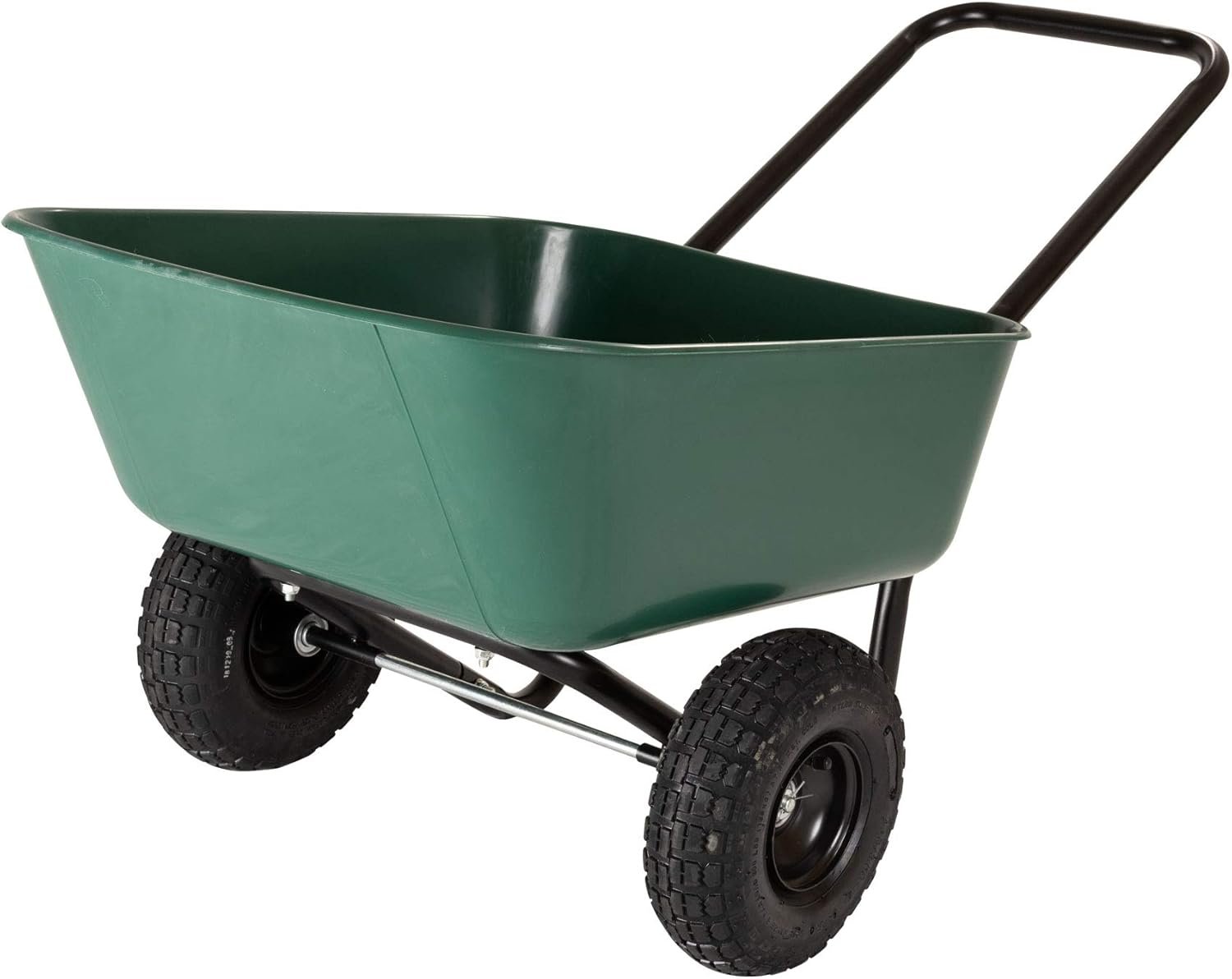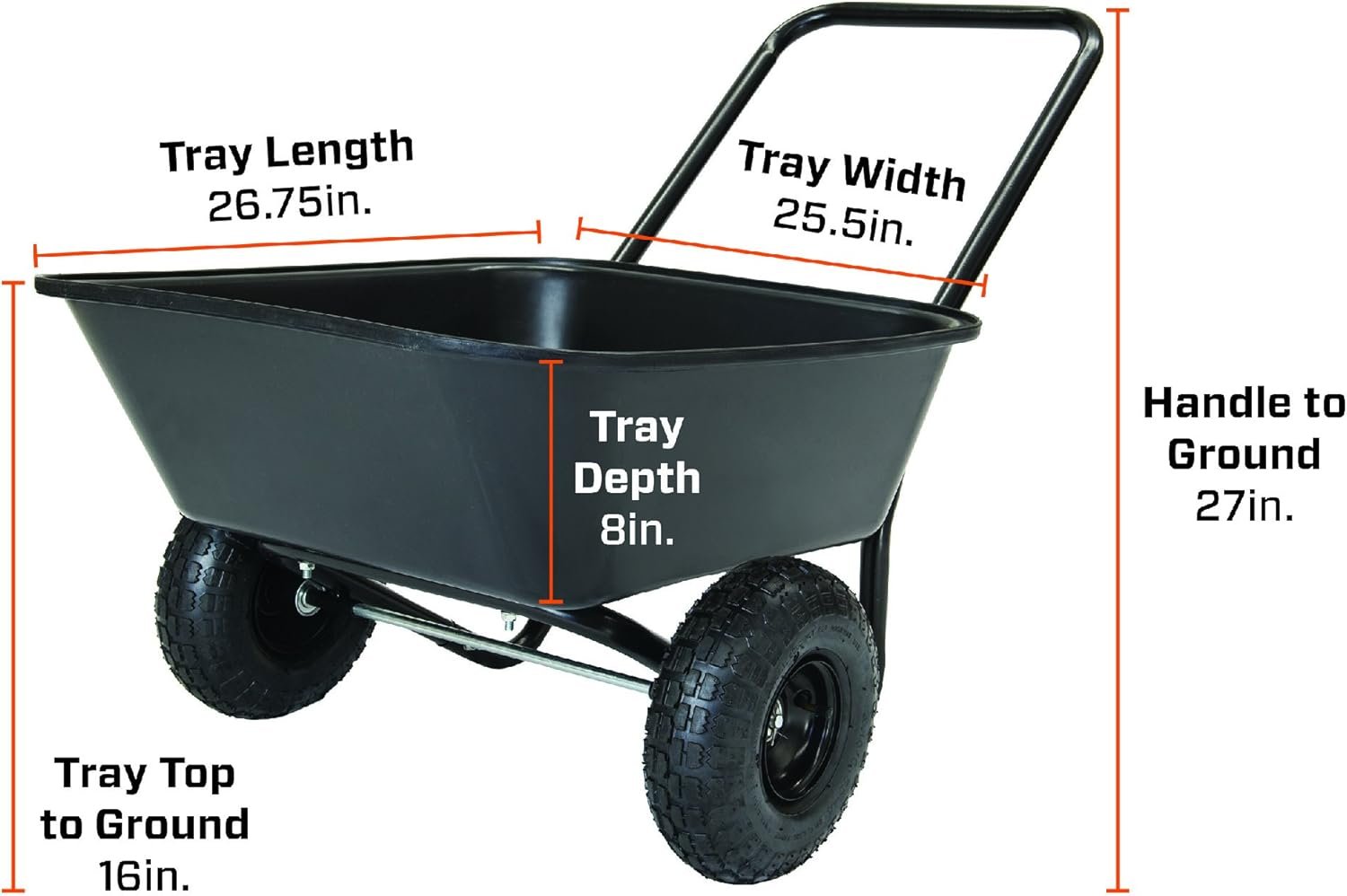 The GARDEN STAR 70019 Garden Barrow Dual-Wheel Residential Wheelbarrow Garden Cart is the ideal choice for any gardener or backyard enthusiast seeking convenience and reliability. Its two air-filled wheels and sturdy, rust-proof 4 cubic foot poly tray deliver superior balance and easy maneuverability, handling up to 300 pounds with ease. The powder-coated loop handle ensures comfortable pushing, pulling, or dumping, while quick assembly makes it a perfect gift. Say goodbye to heavy lifting and make yard tasks effortless with this versatile garden cart.