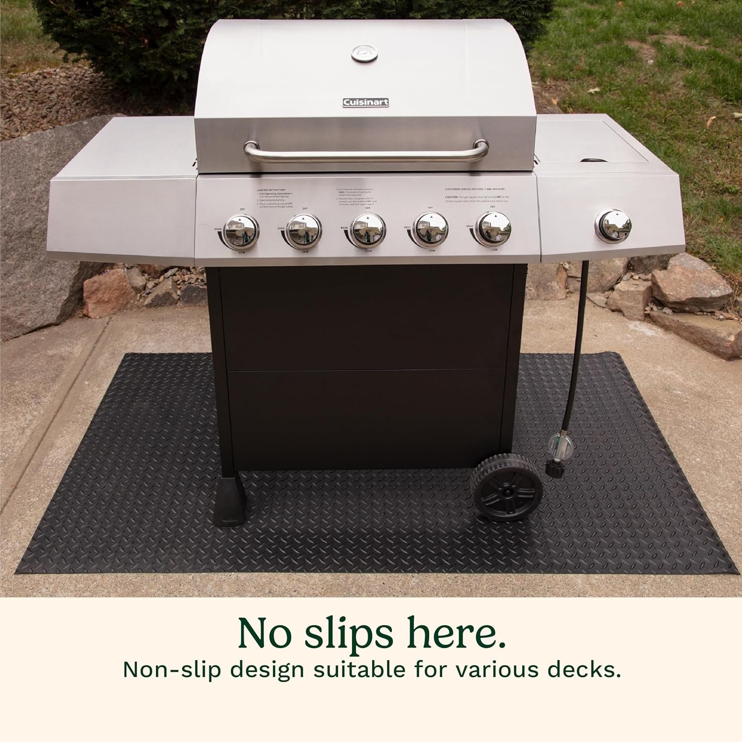 Plus, the mat’s weather-resistant qualities mean it won’t crack or fade after rain, sun, or season changes. Clean-up is easy with just a quick rinse from your hose, making outdoor cooking much less stressful for your deck and porch care.