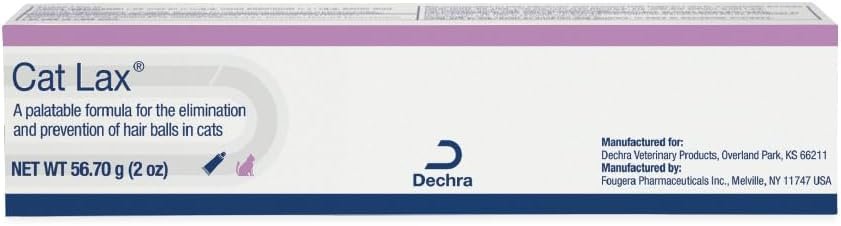 CatLax for Hairball Elimination and Prevention in Cats by Dechra is a palatable laxative designed to help your feline eliminate and prevent hairballs effortlessly. This 2 oz formula not only improves digestion and reduces vomiting, but it also supports skin and coat health with added cod liver oil and vitamin E. Its petroleum-based action coats swallowed hair, allowing it to pass smoothly through your cat’s digestive system—even finicky cats will love the taste. Give your cat relief and keep them comfortable with CatLax, the trusted solution for hairball management.