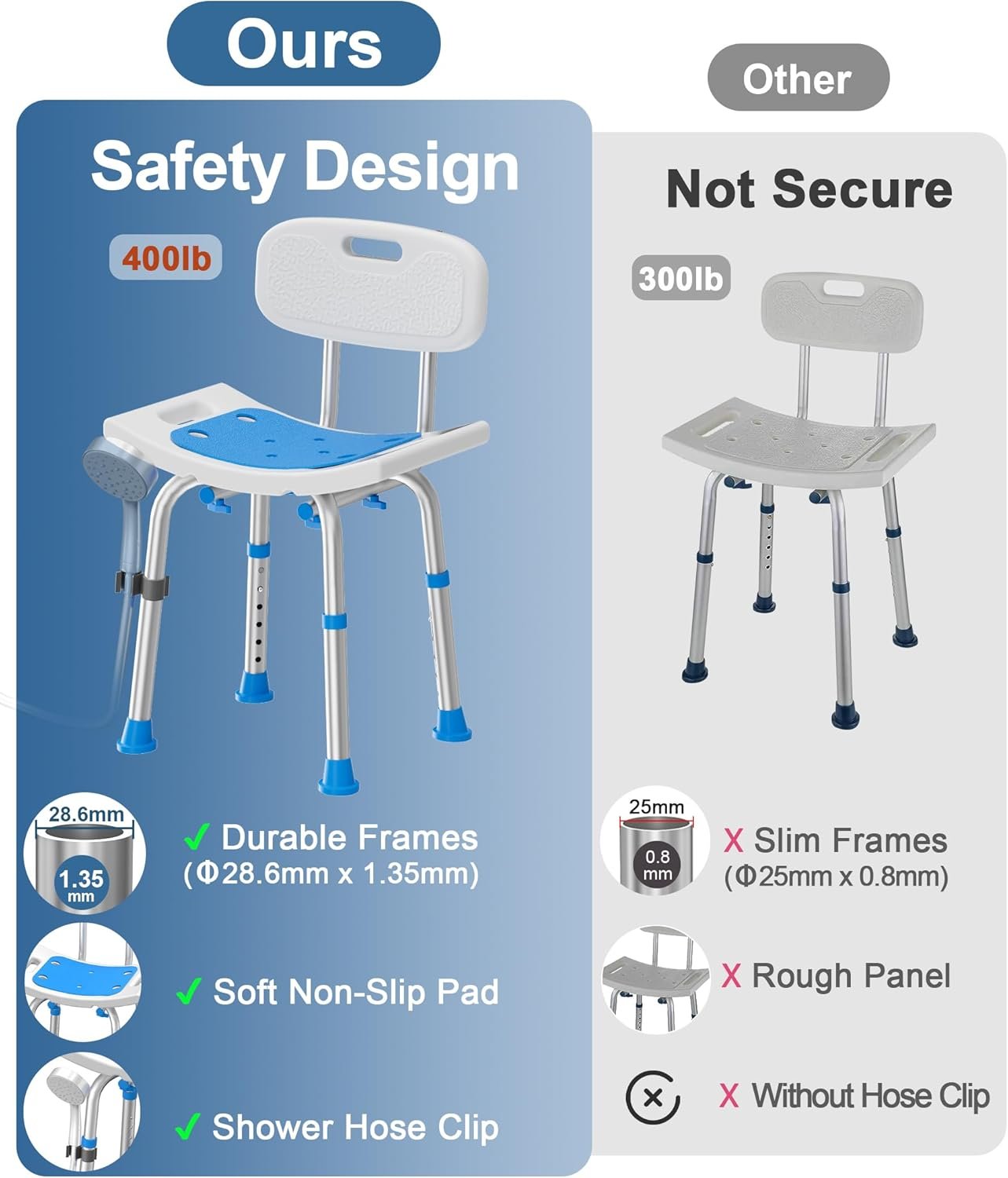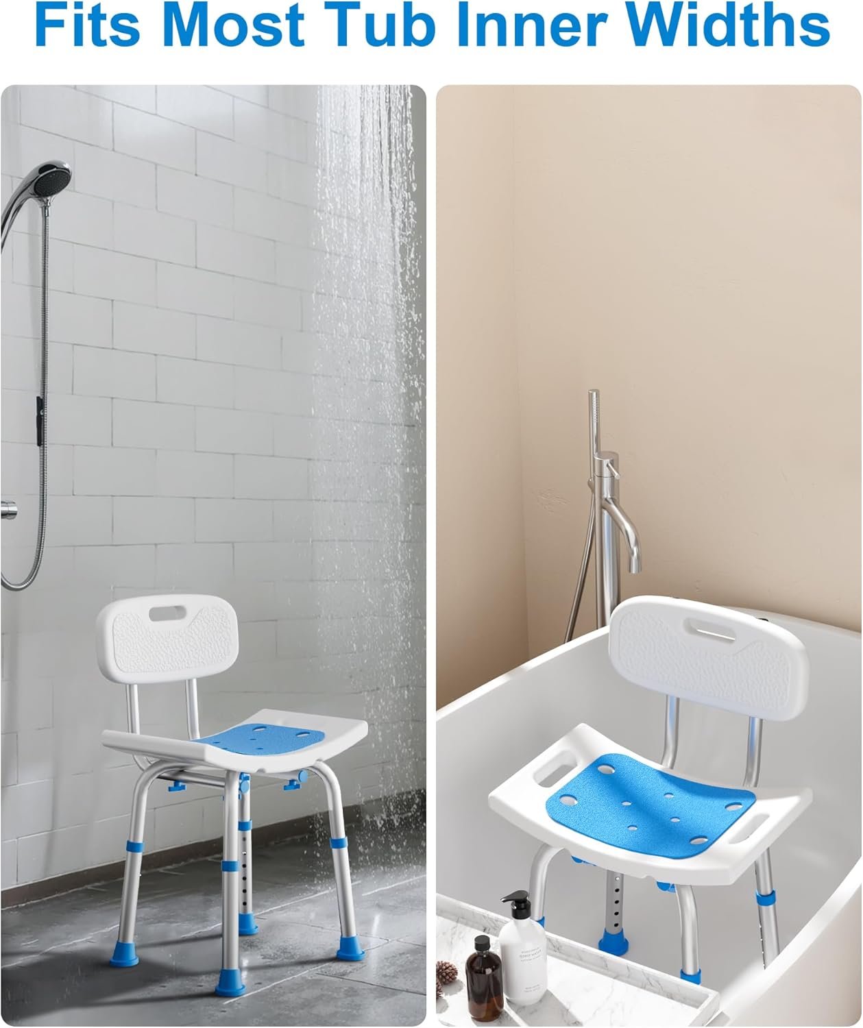 This HOMLAND Adjustable Heavy Duty Shower Chair is designed to enhance bathing safety and comfort for seniors, disabled adults, and users with limited mobility. Built with reinforced aluminum alloy frames and non-slip rubber feet, it supports up to 400 lbs while providing stable seating in showers or bathtubs. The height-adjustable seat and removable backrest allow personalized comfort, and tool-free assembly makes setup quick and effortless. Durable, reliable, and ideal for safer bathing routines.