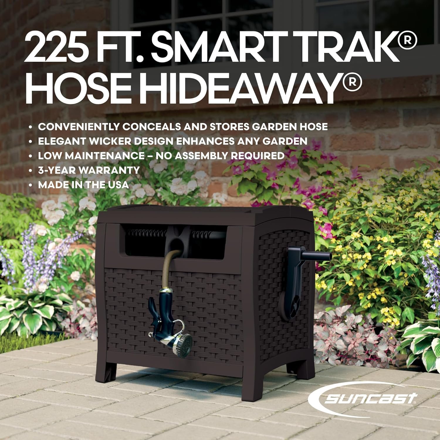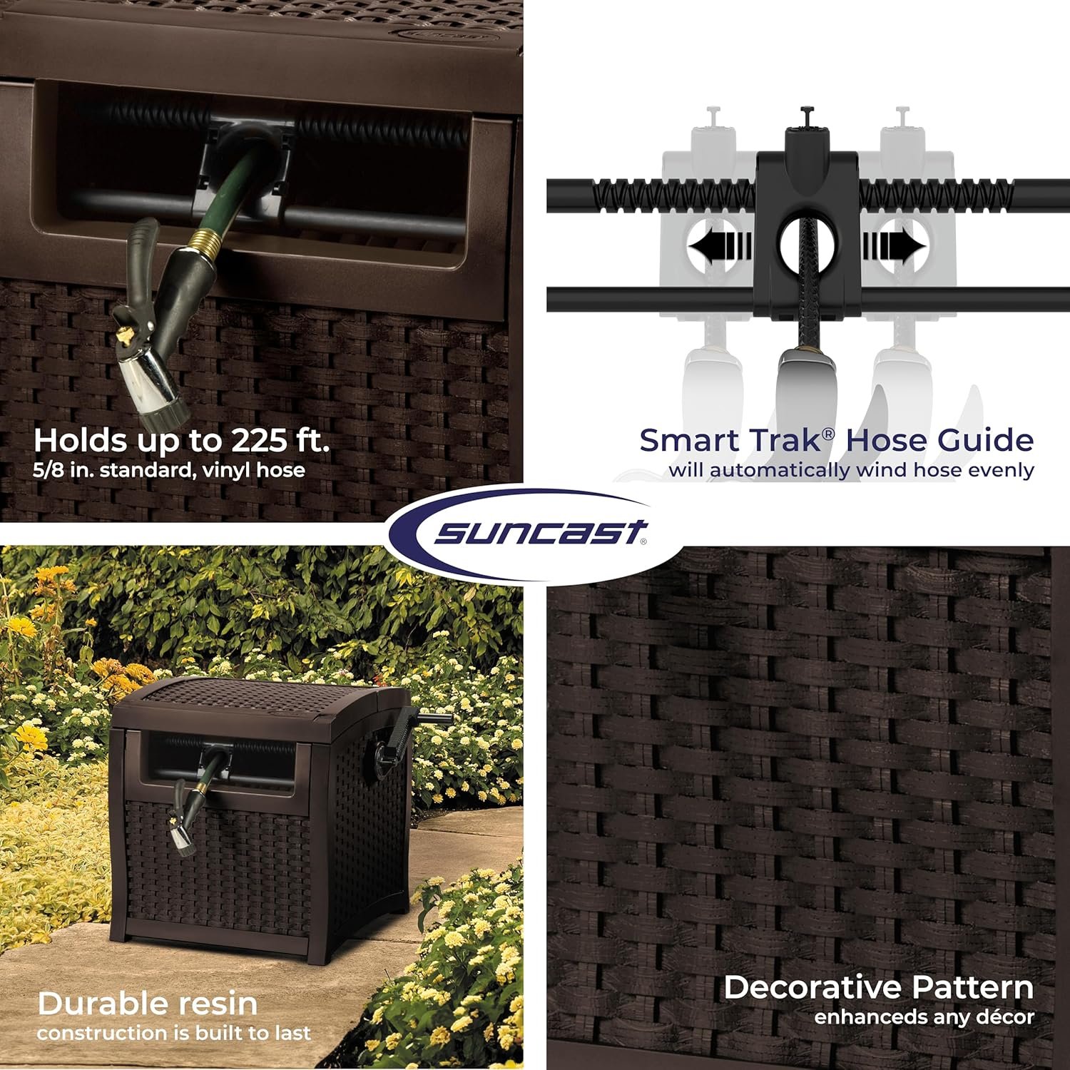 The Suncast Hose Reel with Smart Trak Hose Guide offers a stylish and practical solution for keeping your garden organized. This durable resin hose reel box, featuring a chic wicker-style design, securely stores up to 225 feet of hose and ensures a hassle-free, kink-free winding experience. Its watertight connection prevents leaks, while the sturdy build stands up to the elements for long-lasting use. Perfect for tidy yards, this compact and efficient accessory from the Suncast Store is a must-have for any garden enthusiast.