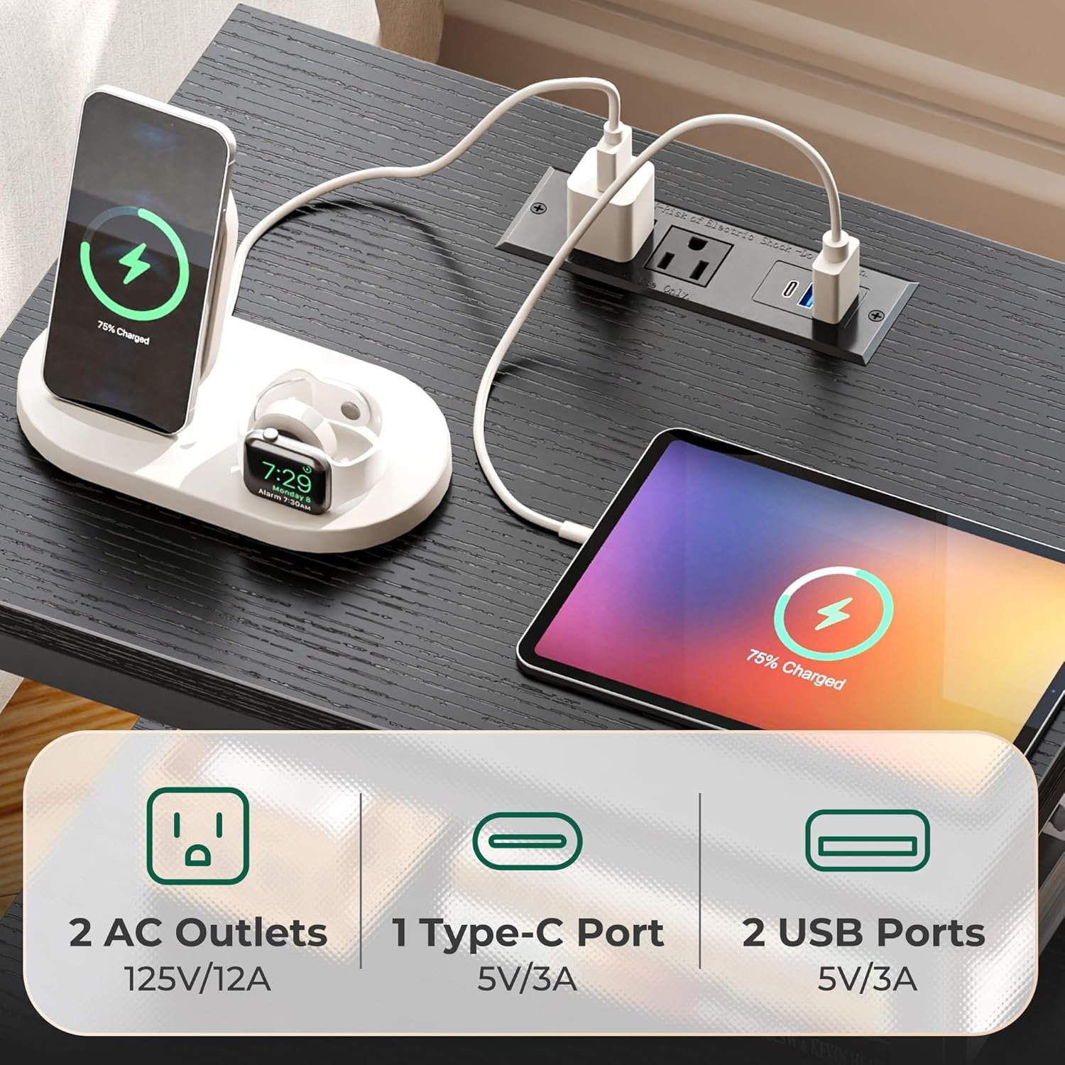The Huuger Charger Station Nightstand with LED Lights is a modern and multifunctional bedside table designed to bring convenience and style to your bedroom or living space. Equipped with built-in power options including 2 AC outlets, 1 USB port, and 1 Type-C port, it allows you to charge your phone, tablet, lamp, and other electronic devices without needing separate adapters. Featuring two fabric drawers and an open shelf, this nightstand provides generous storage for books, accessories, and daily essentials. Its solid structure with a metal frame and adjustable feet ensures stability and durability, while the customizable LED lighting adds a unique ambiance to your room.