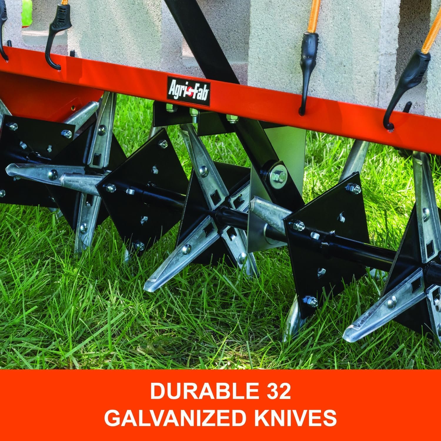 The Agri-Fab 45-0299 48" Tow Behind Lawn Plug Aerator is a top-tier solution for anyone seeking a thicker, healthier lawn. Built in the USA and designed for use with garden tractors, it features 32 galvanized knives that penetrate soil up to 3 inches deep, ensuring superior aeration. With flat-free tires and a user-friendly cantilever handle, it’s easy to use and transport. Backed by a 3-year limited warranty, this Agri-Fab aerator is a reliable and effective investment for your lawn care needs.