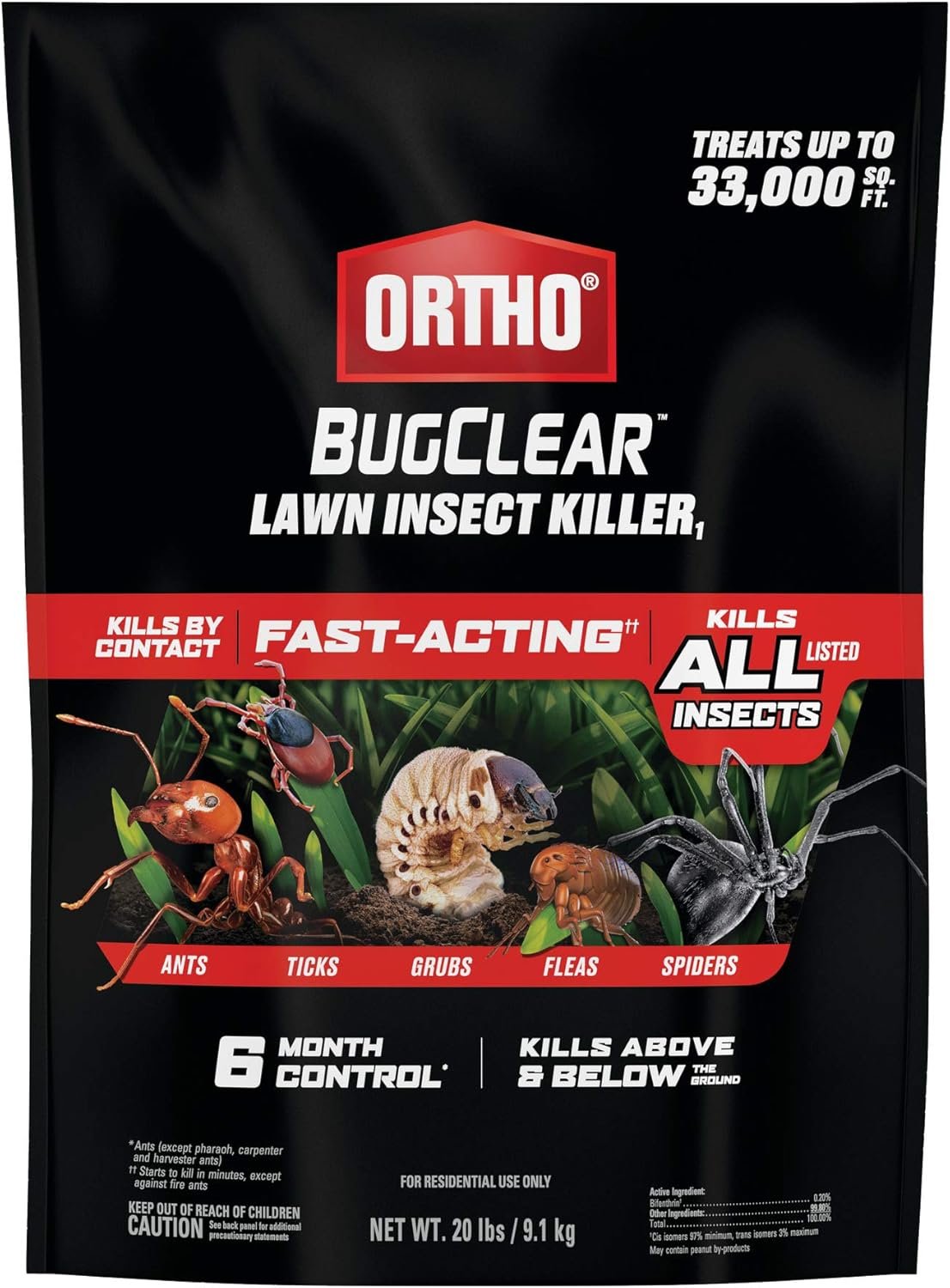 Protect your yard and garden effortlessly with the Ortho BugClear Lawn Insect Killer1 from the Ortho Store. This powerful lawn treatment kills a wide range of pests—including ants, spiders, ticks, fleas, and grubs—on contact, offering up to 6 months of ant control (excluding a few types). Perfect for lawns, flower beds, home perimeters, and even some vegetable plants, its 20 lb. container covers up to 33,000 sq. ft. Easy to apply with a Scotts Spreader, Ortho BugClear is your go-to solution for a pest-free outdoor space.
