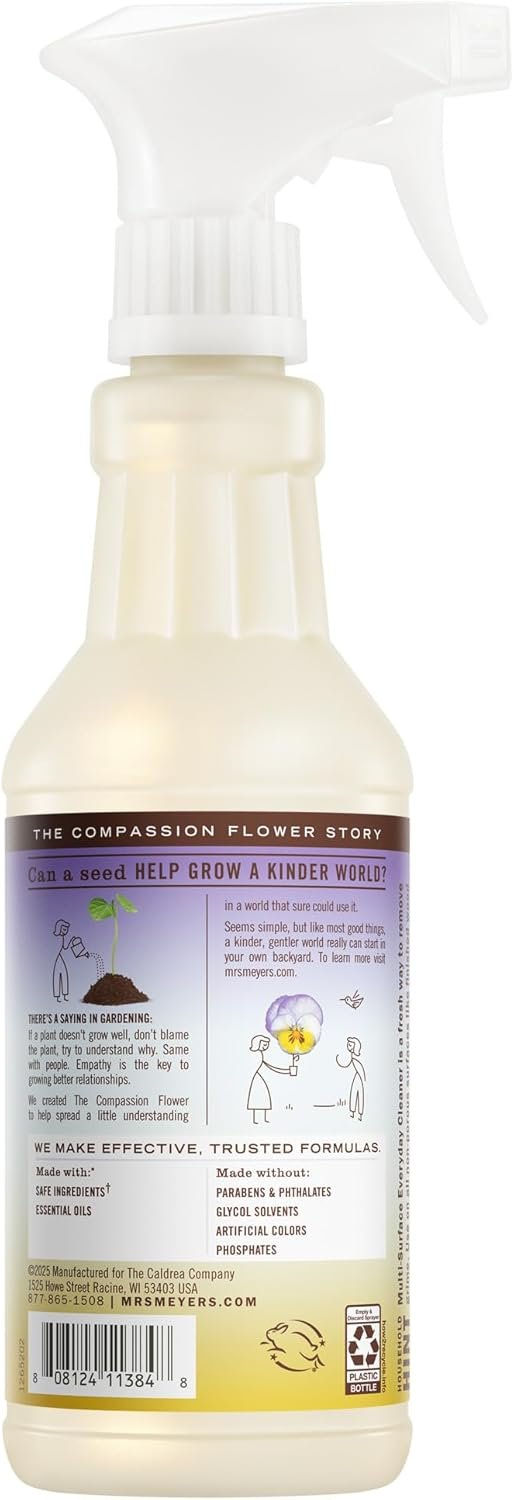Transform your cleaning routine with Mrs. MEYER'S CLEAN DAY Multi-Surface Everyday Cleaner in Compassion Flower scent. This cruelty-free spray quickly removes dirt from nonporous surfaces and leaves your home with a delightful blend of violet, pansy, cedarwood, and lemon. Made with essential oils and free from harsh chemicals, it’s a trusted, garden-inspired choice for a naturally fresh and cared-for home. Ideal for those who value effective cleaning without compromises.