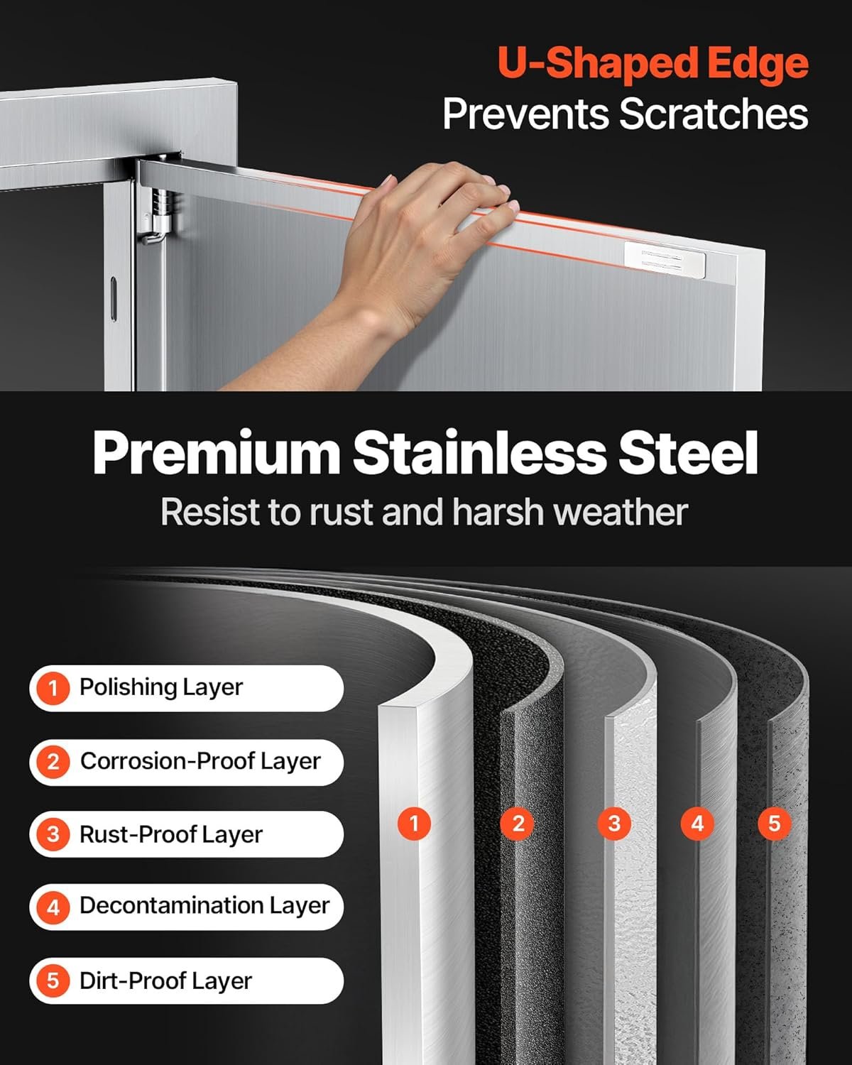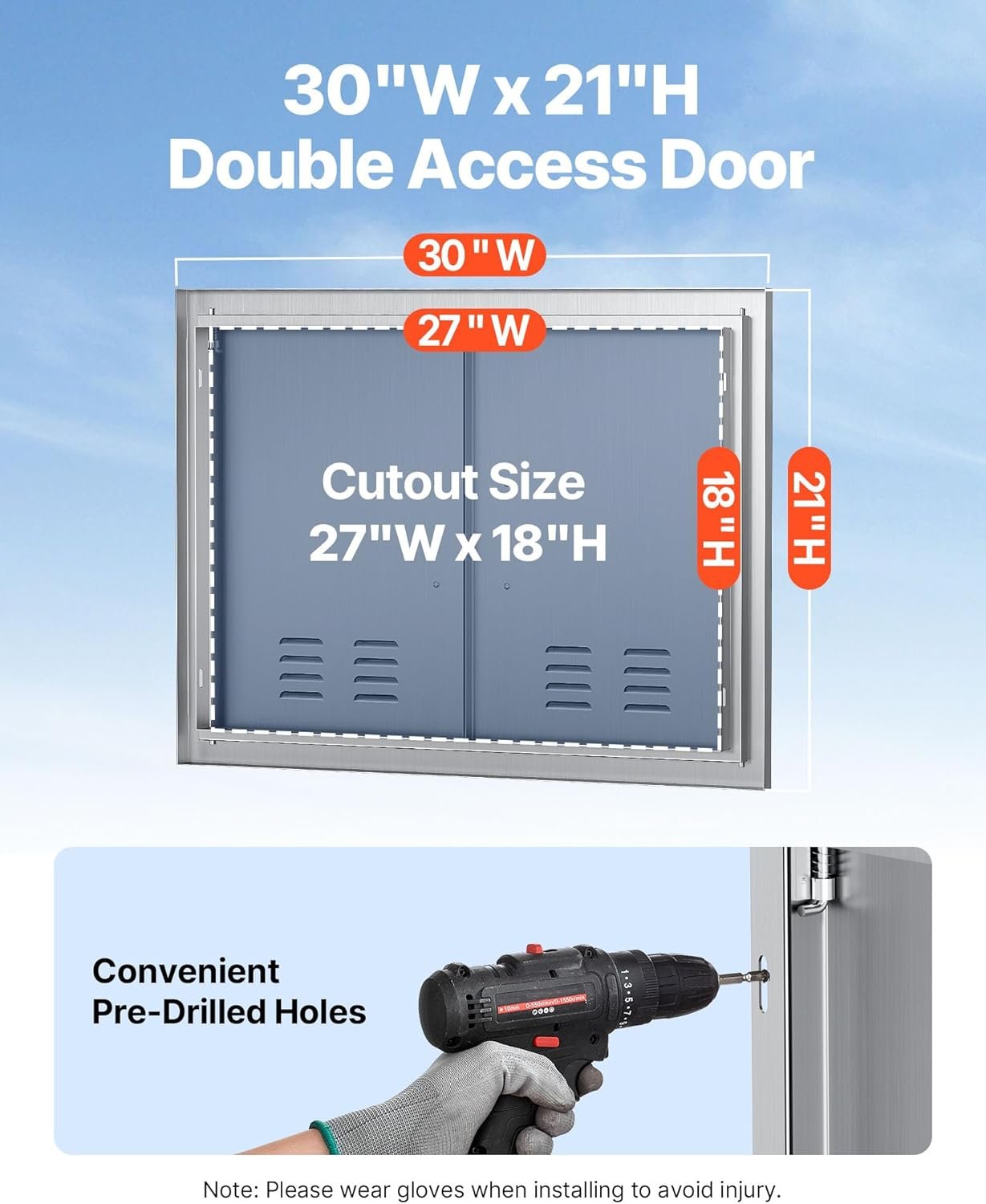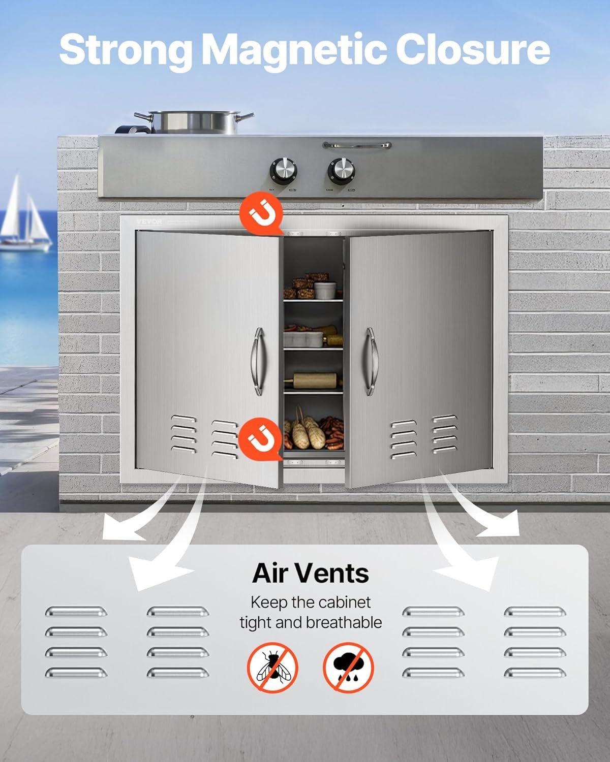 Upgrade your outdoor kitchen with the VEVOR Outdoor Kitchen Doors, crafted from premium 304 stainless steel for superior durability and weather resistance. These 30x21-inch double doors feature a rust-proof, seamless design with ergonomic handles, reversible left/right door installation, and louvred vents for optimal ventilation. The easy-to-install doors come with detachable handles and six hooks for added convenience, making them a versatile and user-friendly solution for any BBQ island. Discover a sleek, reliable, and hassle-free storage upgrade with VEVOR’s trusted quality.
