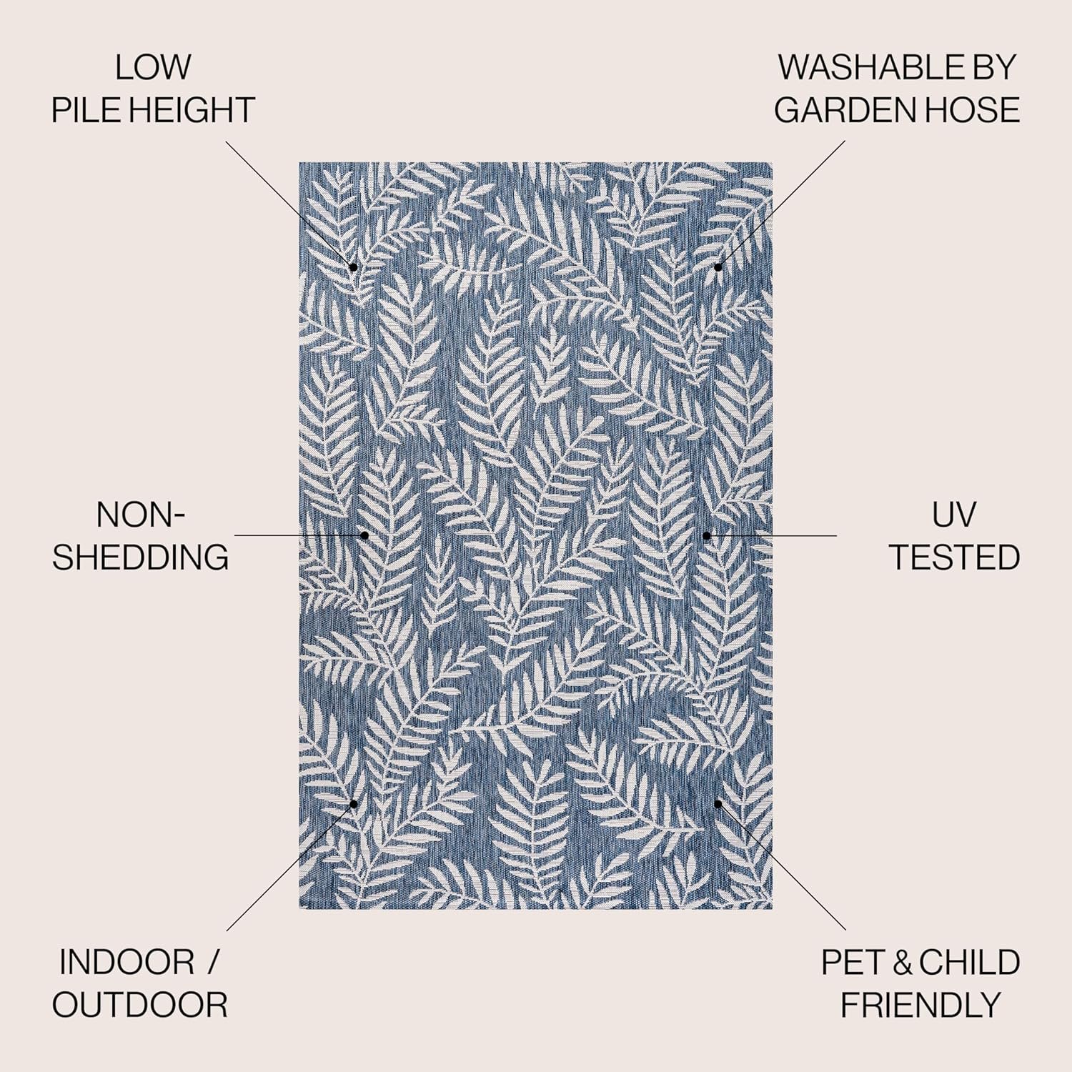 Elevate your indoor or outdoor space with the JONATHAN Y Palm Frond Area Rug, a stylish and durable 8x10 rug designed for high-traffic areas like patios, kitchens, and entryways. Crafted from 100% polypropylene with a flat-weave construction, this navy and ivory rug is stain-resistant, pet-friendly, and easy to clean—perfect for busy households. Its UV-resistant fibers maintain vibrant color, while the low-pile design prevents dirt buildup, making it an excellent choice for families and pet owners alike.