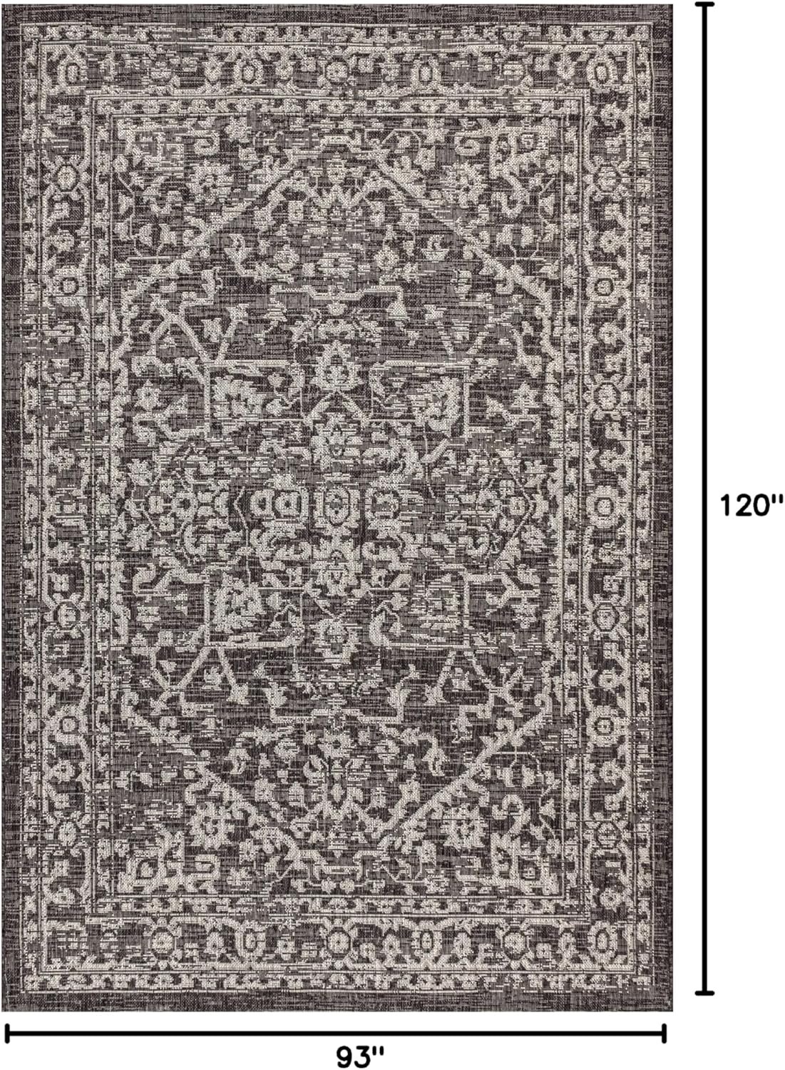 The outdoor rug from JONATHAN Y delivers both style and substance for patio decor and backyard spaces. It sets itself apart with a detailed boho pattern, blending black and gray hues for a timeless, versatile look suitable for any outdoor setting.