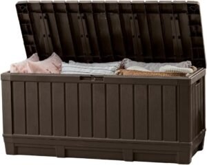 The brown wood-look texture blends well with most exterior décor styles. Internally, it’s roomy enough for seasonal gear, while also serving as a patio bench box for extra seating. Keter’s reputation for quality gives confidence that this product is more than just a basic waterproof outdoor bin.