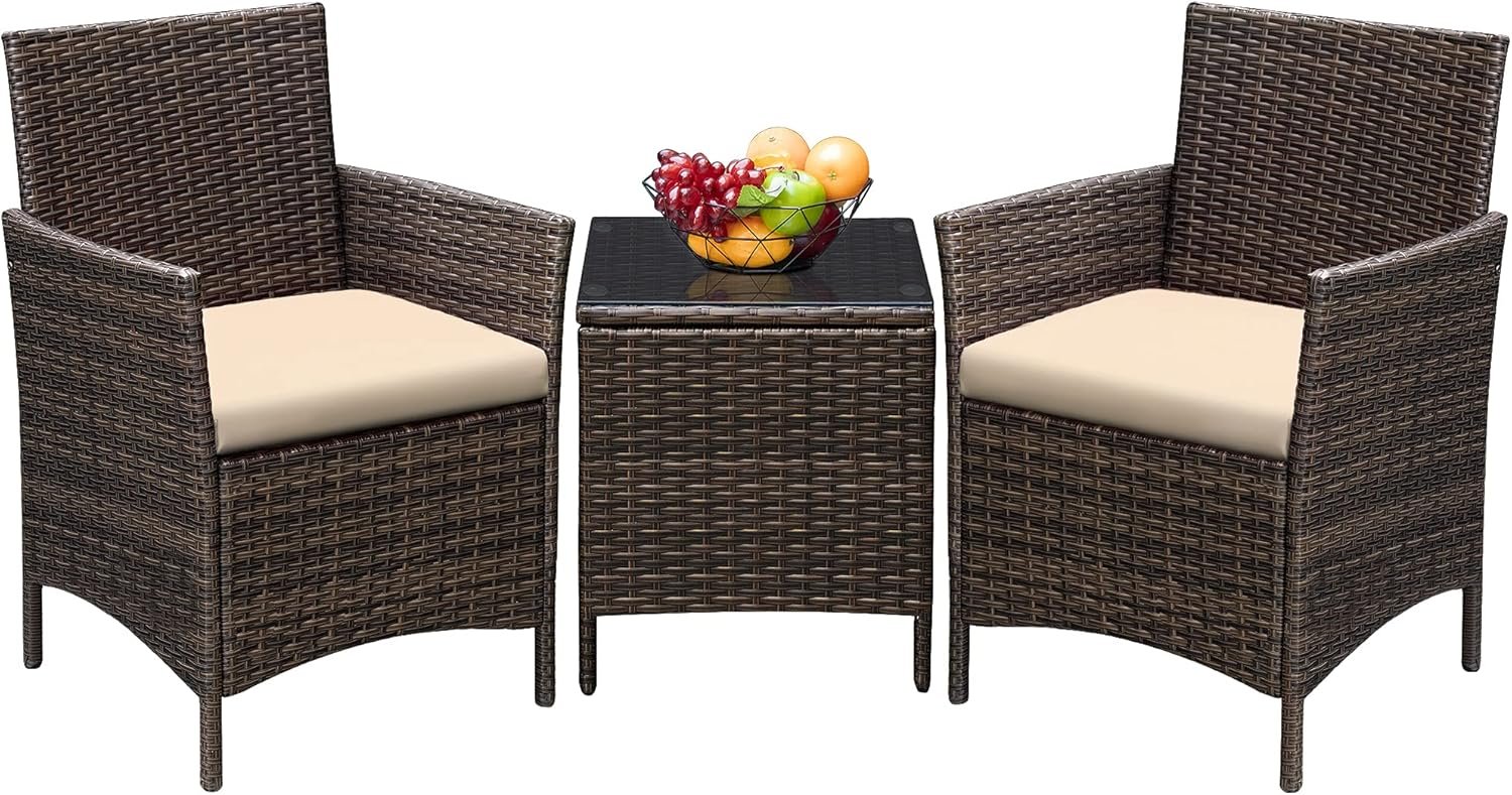Upgrade your outdoor space with the Greesum 3 Pieces Patio Furniture Set, featuring stylish and lightweight PE rattan wicker chairs with plush cushions and a sleek glass coffee table. This durable and weather-resistant set is perfect for relaxing or entertaining on your garden, porch, or poolside, and its compact design makes it fit almost anywhere. Assembly is a breeze with the included instructions, making this Greesum patio furniture set a smart choice for comfort and convenience.