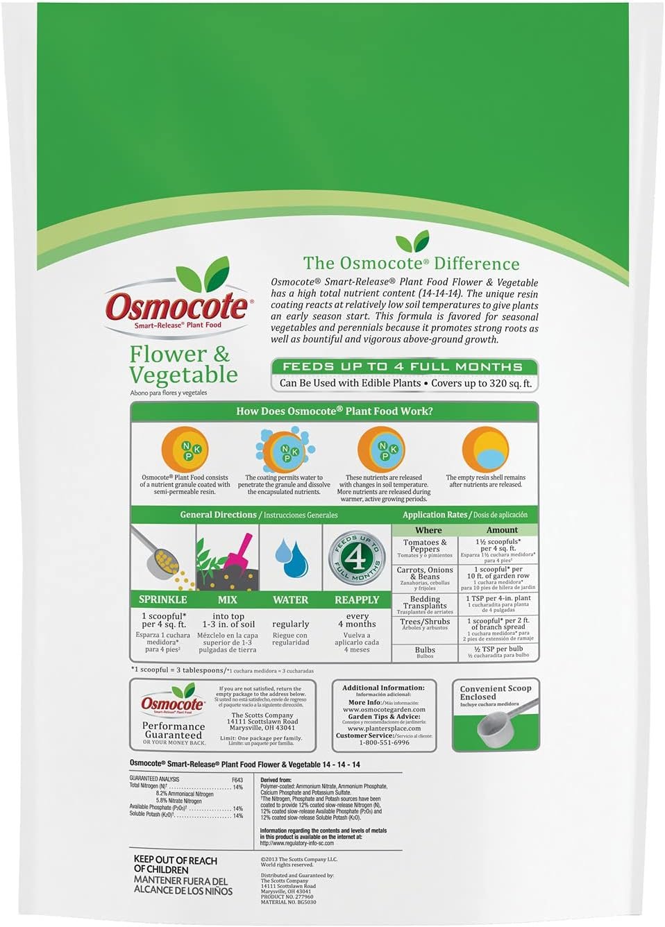 - Osmocote’s highest total nutrient formula: 14-14-14 NPK ratio ensures balanced, continuous release of macro-nutrients critical for garden productivity and bountiful yields.