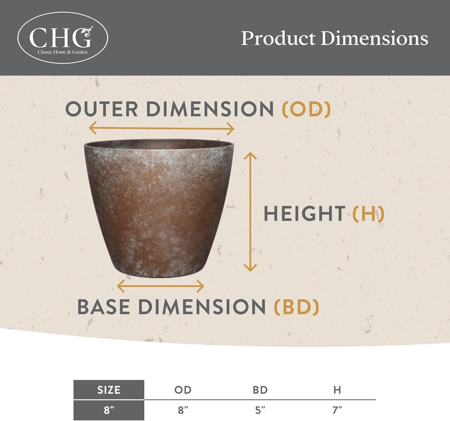 Upgrade your indoor or outdoor space with the Classic Home & Garden Vogue Planter Pot, a stylish 8” resin planter featuring a unique hand-painted, pottery-quality finish. Lightweight yet durable, this UV-resistant pot resists fading and cracking while offering customizable drainage options for your flowers and herbs. Perfect for modern, minimalist, or classic décor, this planter seamlessly combines contemporary design with practical functionality—making it a must-have addition to your home or garden.