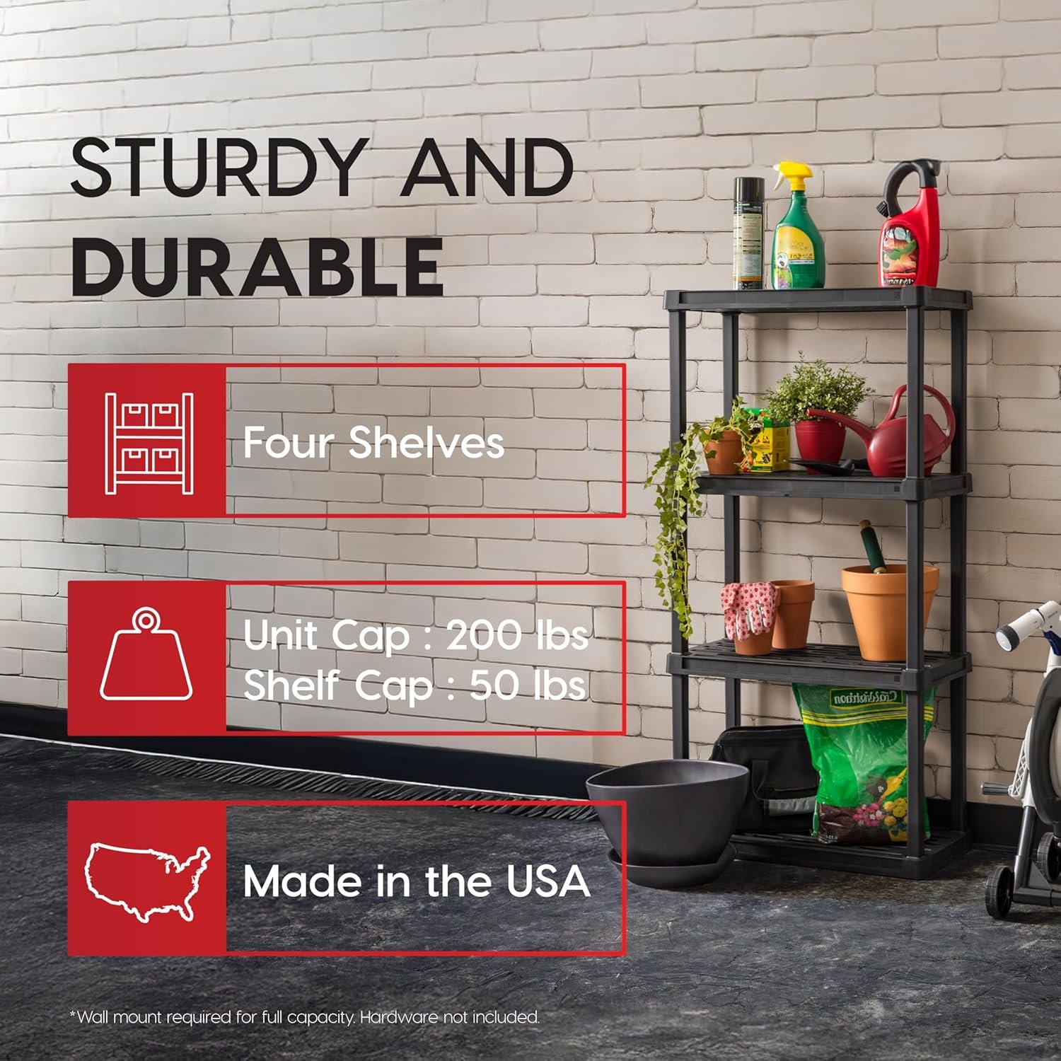 • Freestanding storage that’s versatile: Use as bathroom shelving, a laundry room organizer, or as an open garage organizer. The black plastic finish resists rust and stains, ideal for humid or wet spaces.