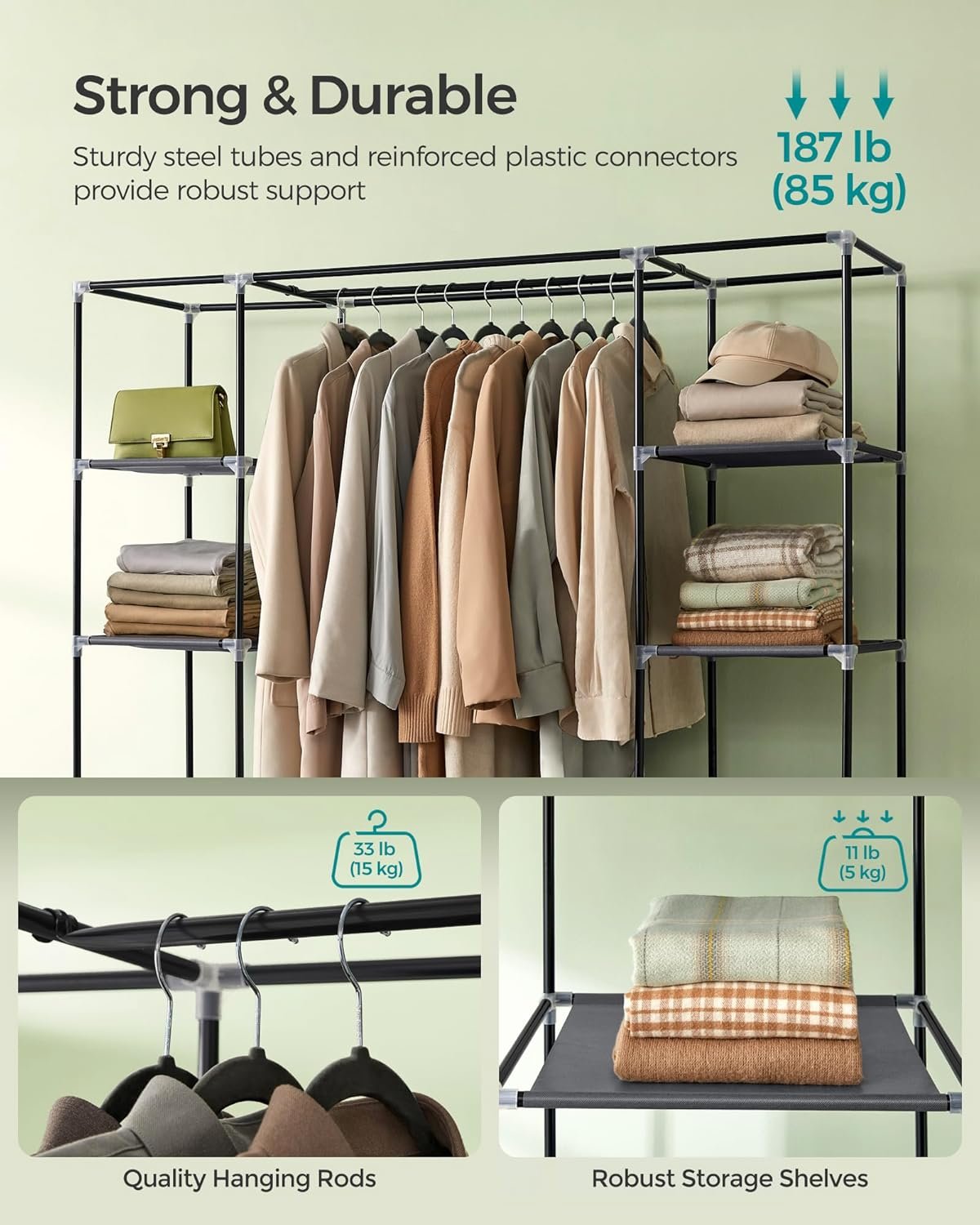 - Robust hanging rod: Holds up to 33 lbs, ideal for suits, coats, or dresses—guaranteed by SONGMICS’s reputation for strong, reliable frames.