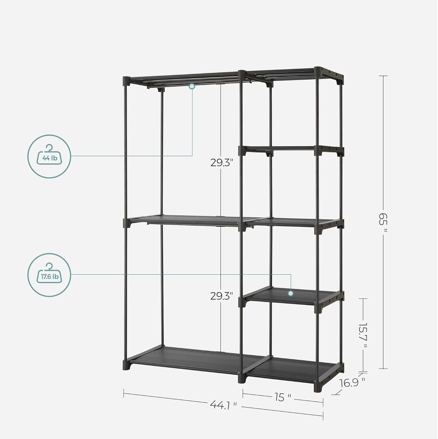 The SONGMICS Portable Closet is a versatile and sturdy freestanding closet organizer, perfect for the bedroom, cloakroom, or entryway. With ample space featuring dual hanging rods and multiple shelves, it easily accommodates all your clothes, including longer garments. Built with durable metal tubes and equipped with an anti-tip kit, this closet offers both robust storage and enhanced safety. Enjoy hassle-free, tool-free assembly and a sleek design that blends seamlessly into any décor—an ideal choice for efficient, stylish organization.