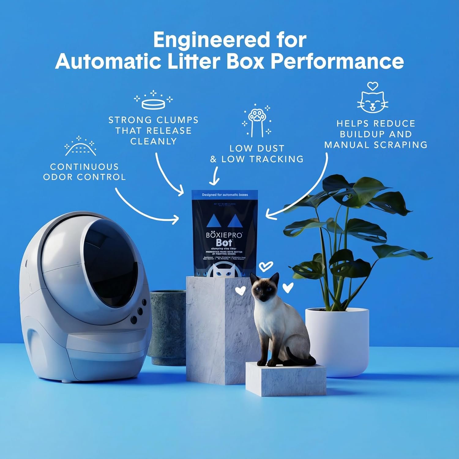 The BoxiePro Bot Probiotic Cat Litter, from the BoxiePro Store, is expertly designed for automatic litter boxes, ensuring smooth operation and minimal mess with strong, fast-clumping clay. This 16 lb litter delivers up to 40 days of odor control by targeting odor-causing bacteria with probiotics, keeping your home fresher for longer. Its low-dust, fragrance-free formula is perfect for sensitive cats and households seeking a cleaner, simpler litter experience. Make litter box maintenance effortless and effective with BoxiePro's advanced clumping and odor control technology.